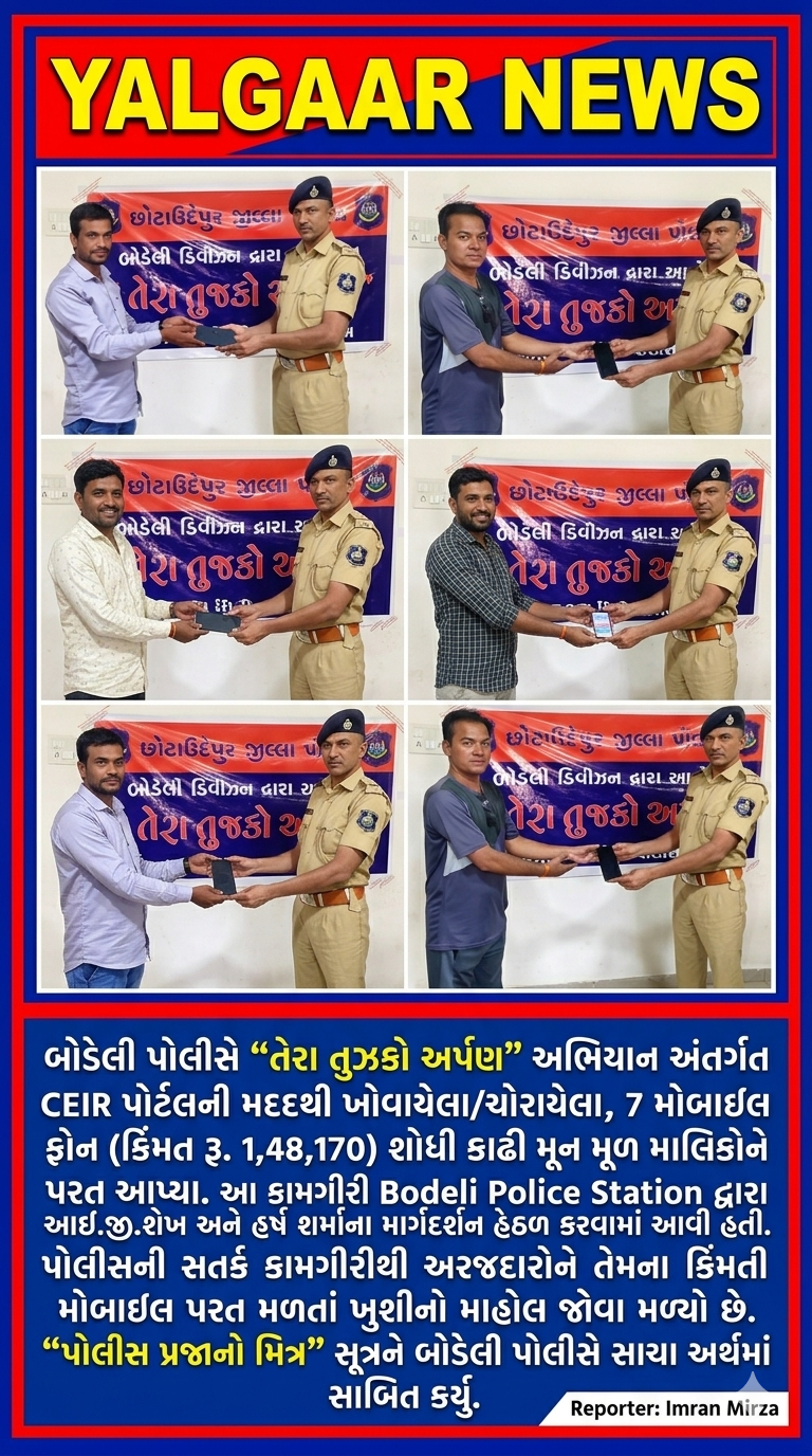 બોડેલી પોલીસે “તેરા તુઝકો અર્પણ” અભિયાન અંતર્ગત CEIR પોર્ટલની મદદથી ખોવાયેલા/ચોરાયેલા 7 મોબાઇલ ફોન (કિંમત રૂ. 1,48,170) શોધી કાઢી મૂળ માલિકોને પરત આપ્યા.