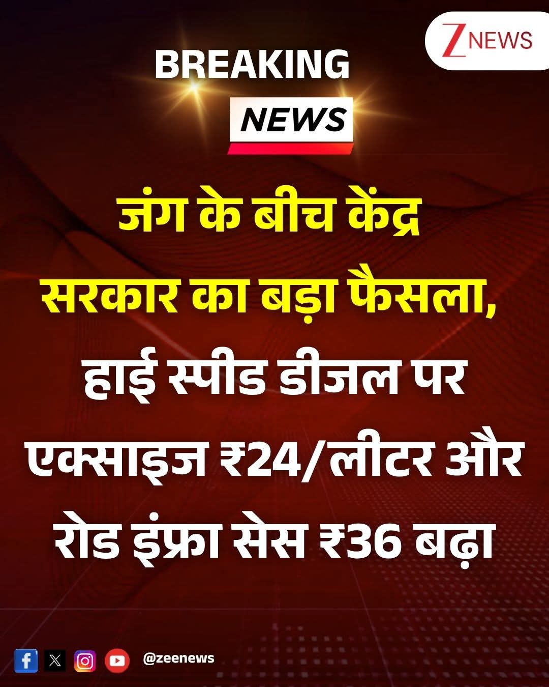 भारत सरकार ने 11 अप्रैल 2026 को डीजल को लेकर नया नोटिस जारी किया है. सरकार ने हाई स्पीड डीजल पर लगने वाला एक्साइज टैक्स और सड़क व इंफ्रास्ट्रक्चर सेस बढ़ा दिया है. स्पेशल एक्साइज ड्यूटी को बढ़ाकर अब 24 रुपये प्रति लीटर कर दिया गया है. विकास कार्यों के तहत लिए जाने वाले इस सेस को अब 36 रुपये प्रति लीटर कर दिया गया है. केंद्र सरकार ने शनिवार को ऐलान किया कि डीजल पर एक्सपोर्ट ड्यूटी को ₹21.5 प्रति लीटर से बढ़ाकर ₹55.5 प्रति लीटर कर दिया गया है. साथ ही सरकार ने ये भी बताया कि हाई स्पीड डीजल पर लगने वाली एक्सपोर्ट ड्यूटी और सेस में भी बढ़ोतरी की गई है.