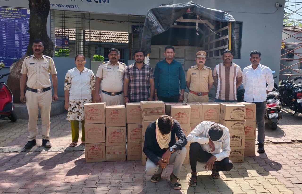 गाडी मध्ये दोन इसम बसलेले दिसले त्यांना पथकाची ओळख सांगुन त्यांना त्यांचे नाव गाव विचारले असता गाडी चालक याने त्याचे नाव १) विशाल पोपट निळे, वय २६ वर्ष, रा. कौठे धांदरपफळ, ता. संगमनेर तसेच शेजारी बसणारे इसमाने त्याचे नाव २) राजेंद्र बाळासाहेब तांबे, वय ३० वर्ष, रा. पेमगिरी, ता. संगमनेर असे सांगीतले त्यांना गाडीमध्ये काय आहे विचारले असता त्यांनी देशी दारुचे बॉक्स असल्याचे सांगितले.त्यांना पथकाने दारु वाहतुक परवाना आहे का?विचारले असता त्यांनी नकार दिला. तसेच त्यांना सदरचा माल कोणाचा व कोठे घेवुन जात असलेबाबत विचारपुस करता त्याने सदरचा माल हा ३) अक्षय मारुती वाकचौरे, रा. परखतपुर, ता. संगमनेर याचे सांगणेनुसार संगमनेर येथील अकोले नाका जवळील ४) उमेश सुर्यवंशी, रा.संगमनेर याचेकडुन खरेदी केला असुन कोतुळ येथे विकण्यासाठी जात असल्याचे सांगीतले. त्यांना झडतीचा उददेश सांगुन गाडीची पंचासमक्ष झडती घेतली असता गाडीमध्ये २,५९,०४०/- रु. किं.च्या देशी बॉबी संत्रा कं. च्या १८० मिली च्या १४८८ व ९० मिली च्या ८०० बॉटल मिळुन आल्या नमुद मुददेमाल तसेच वाहतुक करणारा एक सुपर कॅरी मालवाहतुक गाडी क्रं. एम.एच.१७ सी.व्ही. ४१६२ व दोन मोबाईल असा एकुण ४,६४,५४०/- रुपये किंमतीचा मुददेमाल पंचासमक्ष जप्त करण्यात आला आहे.गुन्हयातील आरोपी १) विशाल पोपट निळे, २) राजेंद्र बाळासाहेब तांबे, ३) अक्षय मारुती वाकचौरे(फरार) ४) उमेश सुर्यवंशी यांच्याविरूध्द अकोले पो.स्टे. गु.र.नं. २०८/२०२६ मु.प्रोव्हि.का.क. ६५ (अ), (ई), ८३ प्रमाणे गुन्हा दाखल करण्यात आला आहे.
