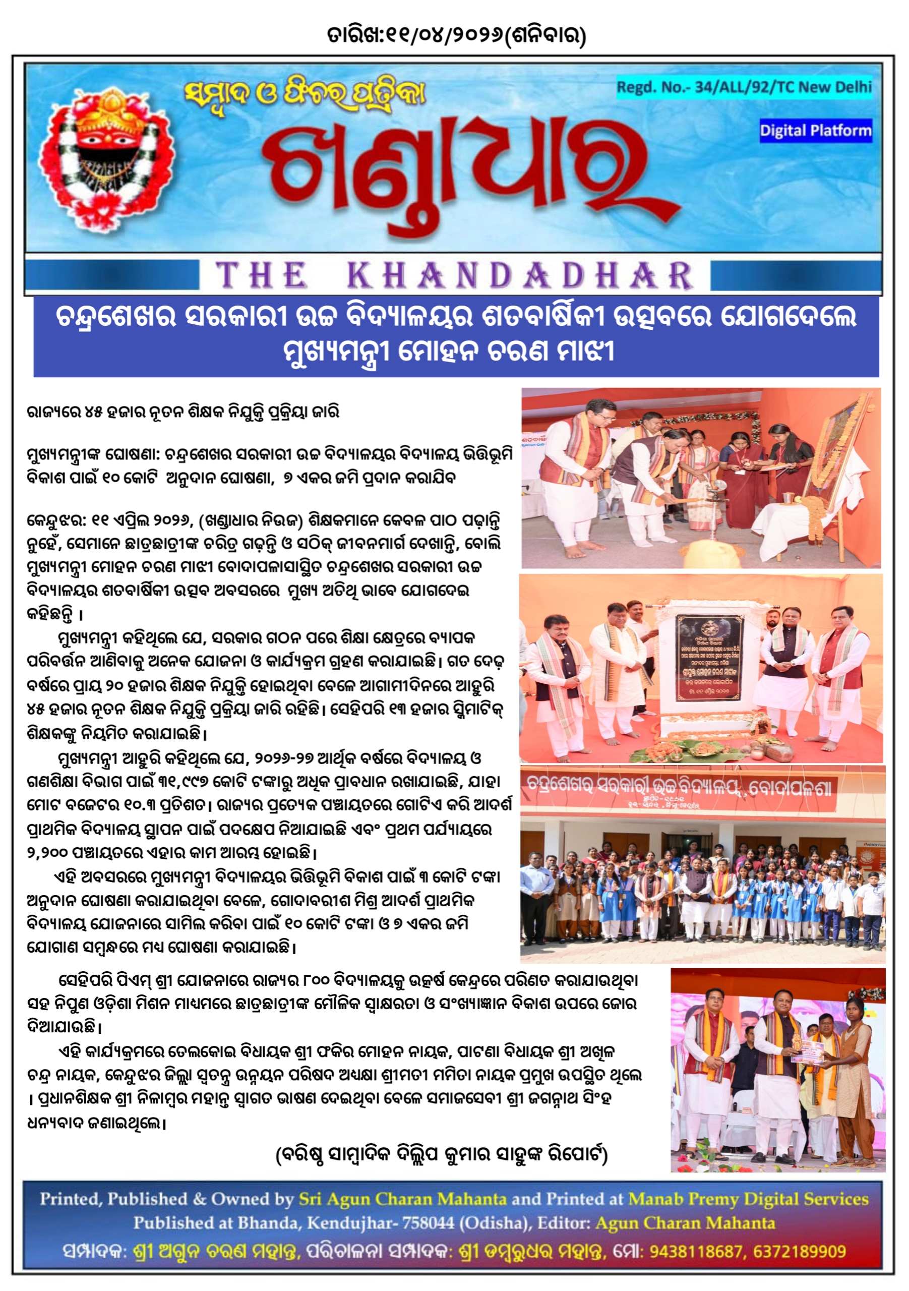 ଚନ୍ଦ୍ରଶେଖର ସରକାରୀ ଉଚ୍ଚ ବିଦ୍ୟାଳୟର ଶତବାର୍ଷିକୀ ଉତ୍ସବରେ ଯୋଗଦେଲେ ମୁଖ୍ୟମନ୍ତ୍ରୀ ମୋହନ ଚରଣ ମାଝୀ।