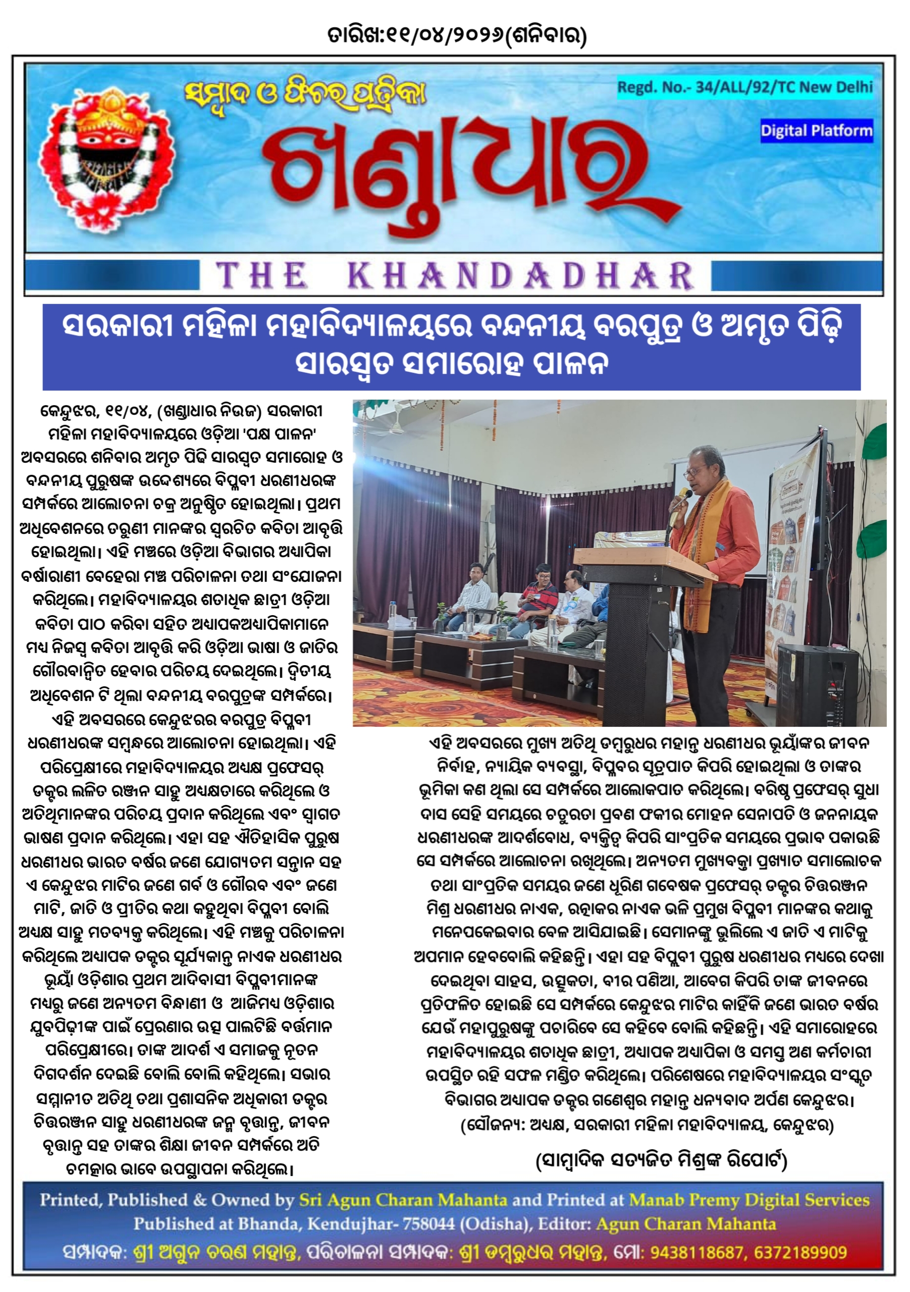କେନ୍ଦୁଝର, ୧୧/୦୪, ସରକାରୀ ମହିଳା ମହାବିଦ୍ୟାଳୟରେ ଓଡ଼ିଆ ' ପକ୍ଷ ପାଳନ ' ଅବସରରେ ଶନିବାର ଅମୃତ ପିଢି ସାରସ୍ୱତ ସମାରୋହ ଓ ବନ୍ଦନୀୟ ପୁରୁଷଙ୍କ ଉଦ୍ଦେଶ୍ୟରେ ବିପ୍ଳବୀ ଧରଣୀଧରଙ୍କ ସମ୍ପର୍କରେ ଆଲୋଚନା ଚକ୍ର ଅନୁଷ୍ଠିତ ହୋଇଥିଲା । ପ୍ରଥମ ଅଧିବେଶନରେ ତରୁଣୀ ମାନଙ୍କର ସ୍ୱରଚିତ କବିତା ଆବୃତ୍ତି ହୋଇଥିଲା । ଏହି ମଞ୍ଚରେ ଓଡ଼ିଆ ବିଭାଗର ଅଧ୍ୟାପିକା ବର୍ଷାରାଣୀ ବେହେରା ମଞ୍ଚ ପରିଚାଳନା ତଥା ସଂଯୋଜନା କରିଥିଲେ । ମହାବିଦ୍ୟାଳୟର ଶତାଧିକ ଛାତ୍ରୀ ଓଡ଼ିଆ କବିତା ପାଠ କରିବା ସହିତ ଅଧ୍ୟାପକଅଧ୍ୟାପିକାମାନେ ମଧ୍ୟ ନିଜସ୍ୱ କବିତା ଆବୃତ୍ତି କରି ଓଡ଼ିଆ ଭାଷା ଓ ଜାତିର ଗୌରବାନ୍ୱିତ ହେବାର ପରିଚୟ ଦେଇଥିଲେ । ଦ୍ୱିତୀୟ ଅଧିବେଶନ ଟି ଥିଲା ବନ୍ଦନୀୟ ବରପୁତ୍ରଙ୍କ ସମ୍ପର୍କରେ । ଏହି ଅବସରରେ କେନ୍ଦୁଝରର ବରପୁତ୍ର ବିପ୍ଳବୀ ଧରଣୀଧରଙ୍କ ସମ୍ବନ୍ଧରେ ଆଲୋଚନା ହୋଇଥିଲା । ଏହି ପରିପ୍ରେକ୍ଷୀରେ ମହାବିଦ୍ୟାଳୟର ଅଧ୍ୟକ୍ଷ ପ୍ରଫେସର୍ ଡକ୍ଟର ଲଳିତ ରଞ୍ଜନ ସାହୁ ଅଧ୍ୟକ୍ଷତାରେ କରିଥିଲେ ଓ ଅତିଥିମାନଙ୍କର ପରିଚୟ ପ୍ରଦାନ କରିଥିଲେ ଏବଂ ସ୍ବାଗତ ଭାଷଣ ପ୍ରଦାନ କରିଥିଲେ । ଏହା ସହ ଐତିହାସିକ ପୁରୁଷ ଧରଣୀଧର ଭାରତ ବର୍ଷର ଜଣେ ଯୋଗ୍ୟତମ ସନ୍ତାନ ସହ ଏ କେନ୍ଦୁଝର ମାଟିର ଜଣେ ଗର୍ବ ଓ ଗୌରବ ଏବଂ ଜଣେ ମାଟି, ଜାତି ଓ ପ୍ରୀତିର କଥା କହୁଥିବା ବିପ୍ଳବୀ ବୋଲି ଅଧ୍ୟକ୍ଷ ସାହୁ ମତବ୍ୟକ୍ତ କରିଥିଲେ । ଏହି ମଞ୍ଚକୁ ପରିଚାଳନା କରିଥିଲେ ଅଧ୍ୟାପକ ଡକ୍ଟର ସୂର୍ଯ୍ୟକାନ୍ତ ନାଏକ ଧରଣୀଧର ଭୂୟାଁ ଓଡ଼ିଶାର ପ୍ରଥମ ଆଦିବାସୀ ବିପ୍ଳବୀମାନଙ୍କ ମଧ୍ୟରୁ ଜଣେ ଅନ୍ୟତମ ବିନ୍ଧାଣୀ ଓ ଆଜିମଧ୍ୟ ଓଡ଼ିଶାର ଯୁବପିଢ଼ୀଙ୍କ ପାଇଁ ପ୍ରେରଣାର ଉତ୍ସ ପାଲଟିଛି ବର୍ତ୍ତମାନ ପରିପ୍ରେକ୍ଷୀରେ । ତାଙ୍କ ଆଦର୍ଶ ଏ ସମାଜକୁ ନୂତନ ଦିଗଦର୍ଶନ ଦେଇଛି ବୋଲି ବୋଲି କହିଥିଲେ । ସଭାର ସମ୍ମାନୀତ ଅତିଥି ତଥା ପ୍ରଶାସନିକ ଅଧିକାରୀ ଡକ୍ଟର ଚିତ୍ତରଞ୍ଜନ ସାହୁ ଧରଣୀଧରଙ୍କ ଜନ୍ମ ବୃତ୍ତାନ୍ତ, ଜୀବନ ବୃତ୍ତାନ୍ତ ସହ ତାଙ୍କର ଶିକ୍ଷା ଜୀବନ ସମ୍ପର୍କରେ ଅତି ଚମତ୍କାର ଭାବେ ଉପସ୍ଥାପନା କରିଥିଲେ । ଏହି ଅବସରରେ ମୁଖ୍ୟ ଅତିଥି ଡମ୍ବରୁଧର ମହାନ୍ତ ଧରଣୀଧର ଭୂୟାଁଙ୍କର ଜୀବନ ନିର୍ବାହ, ନ୍ୟାୟିକ ବ୍ୟବସ୍ଥା, ବିପ୍ଳବର ସୂତ୍ରପାତ କିପରି ହୋଇଥିଲା ଓ ତାଙ୍କର ଭୂମିକା କଣ ଥିଲା ସେ ସମ୍ପର୍କରେ ଆଲୋକପାତ କରିଥିଲେ । ବରିଷ୍ଠ ପ୍ରଫେସର୍ ସୁଧା ଦାସ ସେହି ସମୟରେ ଚତୁରତା ପ୍ରବଣ ଫକୀର ମୋହନ ସେନାପତି ଓ ଜନନାୟକ ଧରଣୀଧରଙ୍କ ଆଦର୍ଶବୋଧ, ବ୍ୟକ୍ତିତ୍ୱ କିପରି ସାଂପ୍ରତିକ ସମୟରେ ପ୍ରଭାବ ପକାଉଛି ସେ ସମ୍ପର୍କରେ ଆଲୋଚନା ରଖିଥିଲେ । ଅନ୍ୟତମ ମୁଖ୍ୟବକ୍ତା ପ୍ରଖ୍ୟାତ ସମାଲୋଚକ ତଥା ସାଂପ୍ରତିକ ସମୟର ଜଣେ ଧୂରିଣ ଗବେଷକ ପ୍ରଫେସର୍ ଡକ୍ଟର ଚିତ୍ତରଞ୍ଜନ ମିଶ୍ର ଧରଣୀଧର ନାଏକ, ରତ୍ନାକର ନାଏକ ଭଳି ପ୍ରମୁଖ ବିପ୍ଳବୀ ମାନଙ୍କର କଥାକୁ ମନେପକେଇବାର ବେଳ ଆସିଯାଇଛି । ସେମାନଙ୍କୁ ଭୁଲିଲେ ଏ ଜାତି ଏ ମାଟିକୁ ଅପମାନ ହେବବୋଲି କହିଛନ୍ତି । ଏହା ସହ ବିପ୍ଲବୀ ପୁରୁଷ ଧରଣୀଧର ମଧ୍ୟରେ ଦେଖା ଦେଇଥିବା ସାହସ, ଉତ୍ସୁକତା, ବୀର ପଣିଆ, ଆବେଗ କିପରି ତାଙ୍କ ଜୀବନରେ ପ୍ରତିଫଳିତ ହୋଇଛି ସେ ସମ୍ପର୍କରେ କେନ୍ଦୁଝର ମାଟିର କାହିଁକି ଜଣେ ଭାରତ ବର୍ଷର ଯେଉଁ ମହାପୁରୁଷଙ୍କୁ ପଚାରିବେ ସେ କହିବେ ବୋଲି କହିଛନ୍ତି । ଏହି