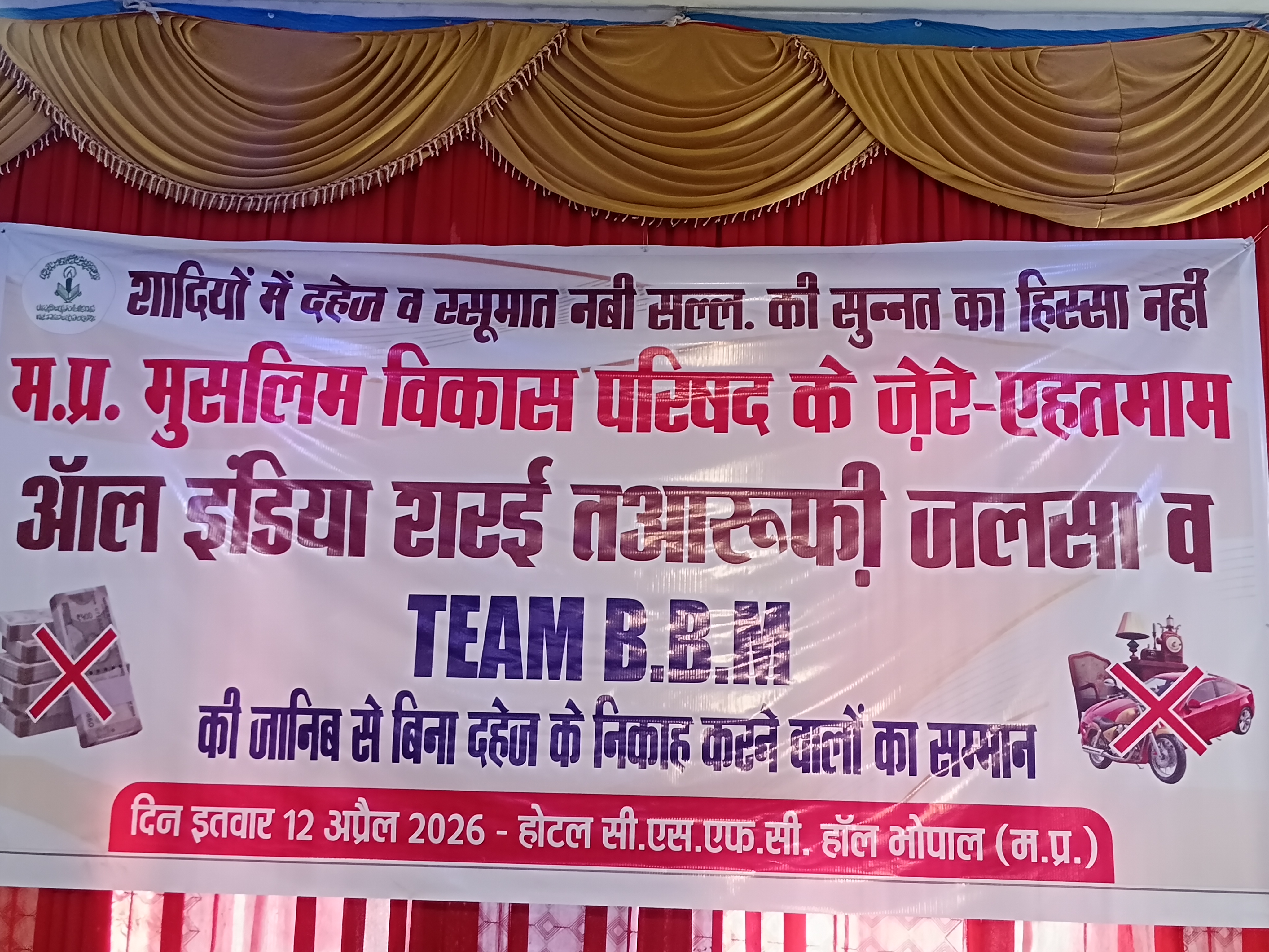 म.प्र.मुस्लिम विकास परिषद और टीम BBM भोपाल के द्वारा एक तआरूफि जलसा 12 अप्रैल इतवार को सी एस एफ सी हॉल घोड़ा नक्कास पर रखा गया था जिसमें म.प्र.मुस्लिम विकास परिषद की और से मुस्लिम नौजवान लड़के लड़कियों के लिए परिचय सम्मेलन और निकाह को आसान बनाने के लिए और निकाह को सुन्नत के मुताबिक करने और शादी में बिना दहेज़ और बिना बारात निकाह करने वालों का टीम BBM की जानिब से सम्मान समारोह आयोजित किया गया था जिसमें ऐसे लोगों का सम्मान किया गया जिन लोगों ने अपने निकाह (शादी) में किसी तरह का न कोई दहेज़ लिया और न दिया और न ही लड़की वालों की तरफ से बारात में खाने का कोई इंतजाम किया शादी को पूरे सुन्नत तरीके और इस्लाम के तरीके के मुताबिक की ऐसे लोगों को टीम BBM की जानिब से मोमेंटो देकर सम्मानित किया गया