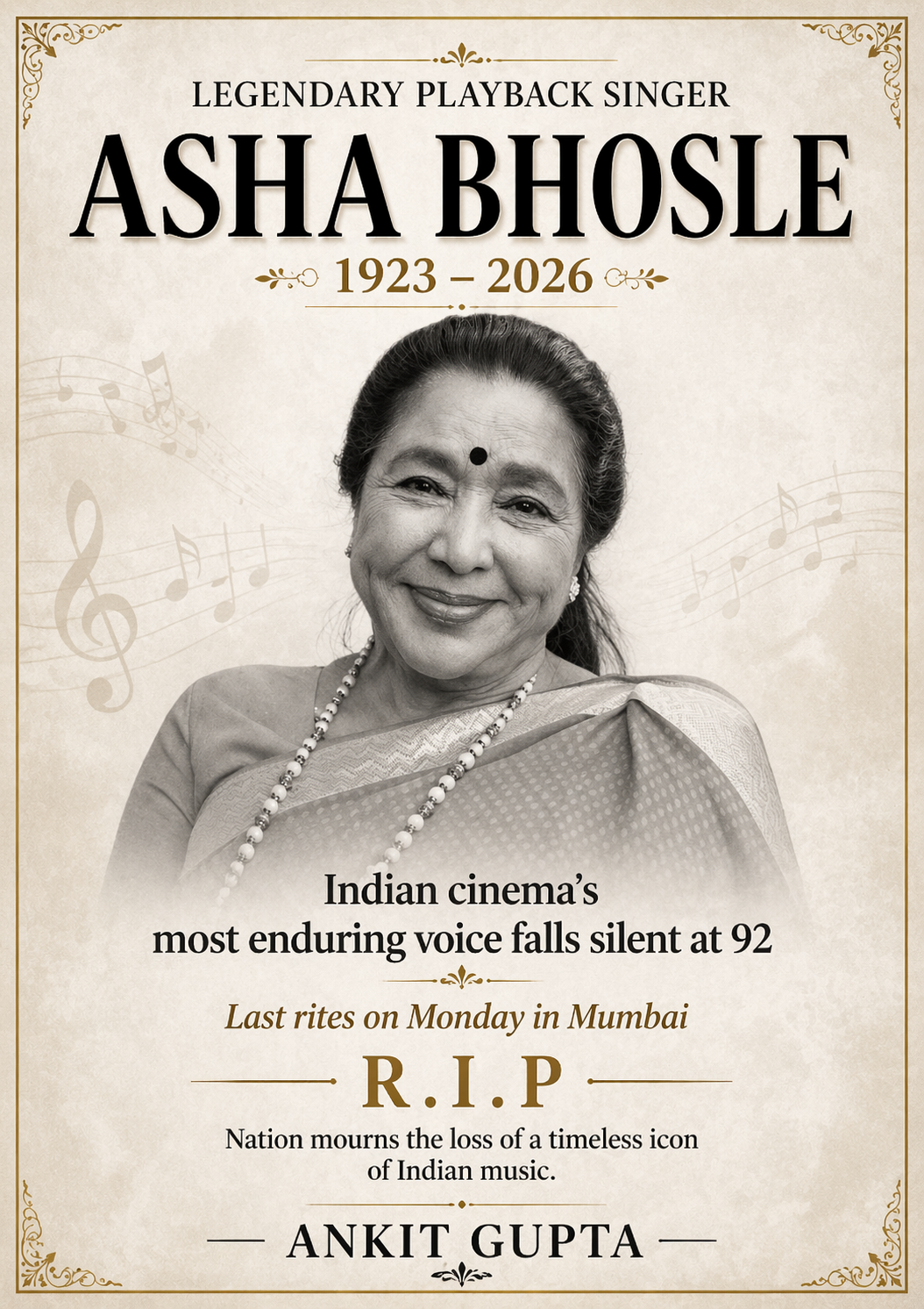 Mumbai, April 12, 2026 — The world of Indian music mourns the loss of one of its most iconic voices as legendary playback singer Asha Bhosle passed away at the age of 92 in Mumbai on Sunday. Known for her unparalleled versatility and a career spanning over seven decades, her demise marks the end of an era in Indian cinema.