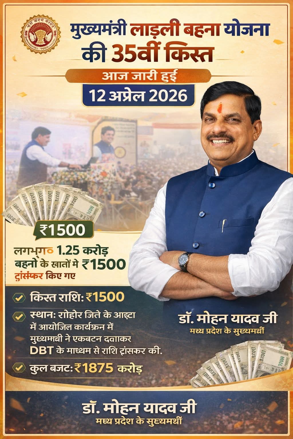 MP News - लाडली बहनों के लिए बड़ी खुशखबरी, आज 12 अप्रैल को मुख्यमंत्री जी ने ट्रांसफर की 35वीं किस्त, लाडली बहनों को मिली 35वीं किस्त की सौगात।