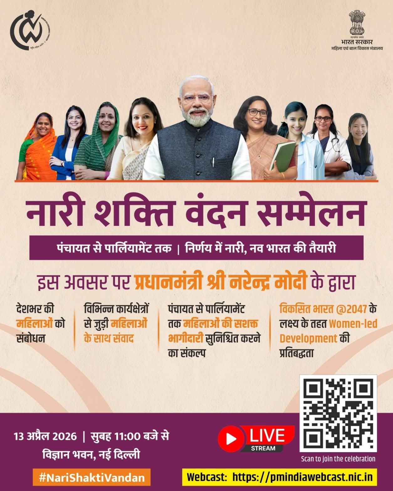 जी 13 अप्रैल 2026 को प्रातः 11:00 बजे विज्ञान भवन, नई दिल्ली में आयोजित राष्ट्रीय स्तर के #नारी_शक्ति_वंदन_सम्मेलन को संबोधित करेंगे।