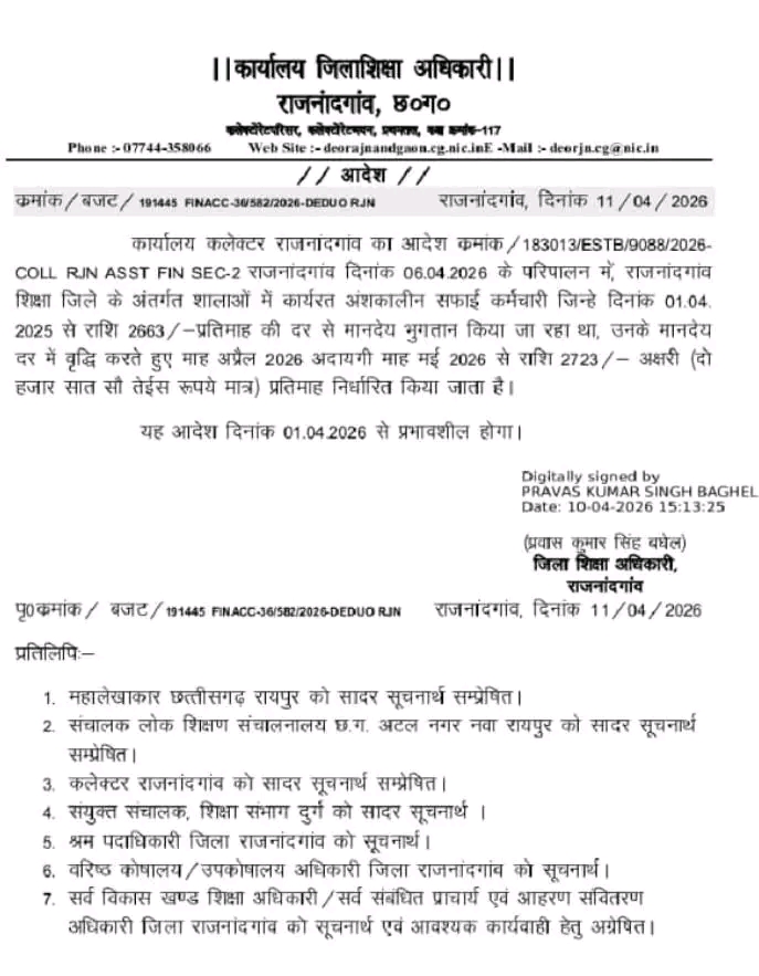 छत्तीसगढ़ राज्य में स्कूल सफाई कर्मचारी मानदेय वृद्धि आदेश