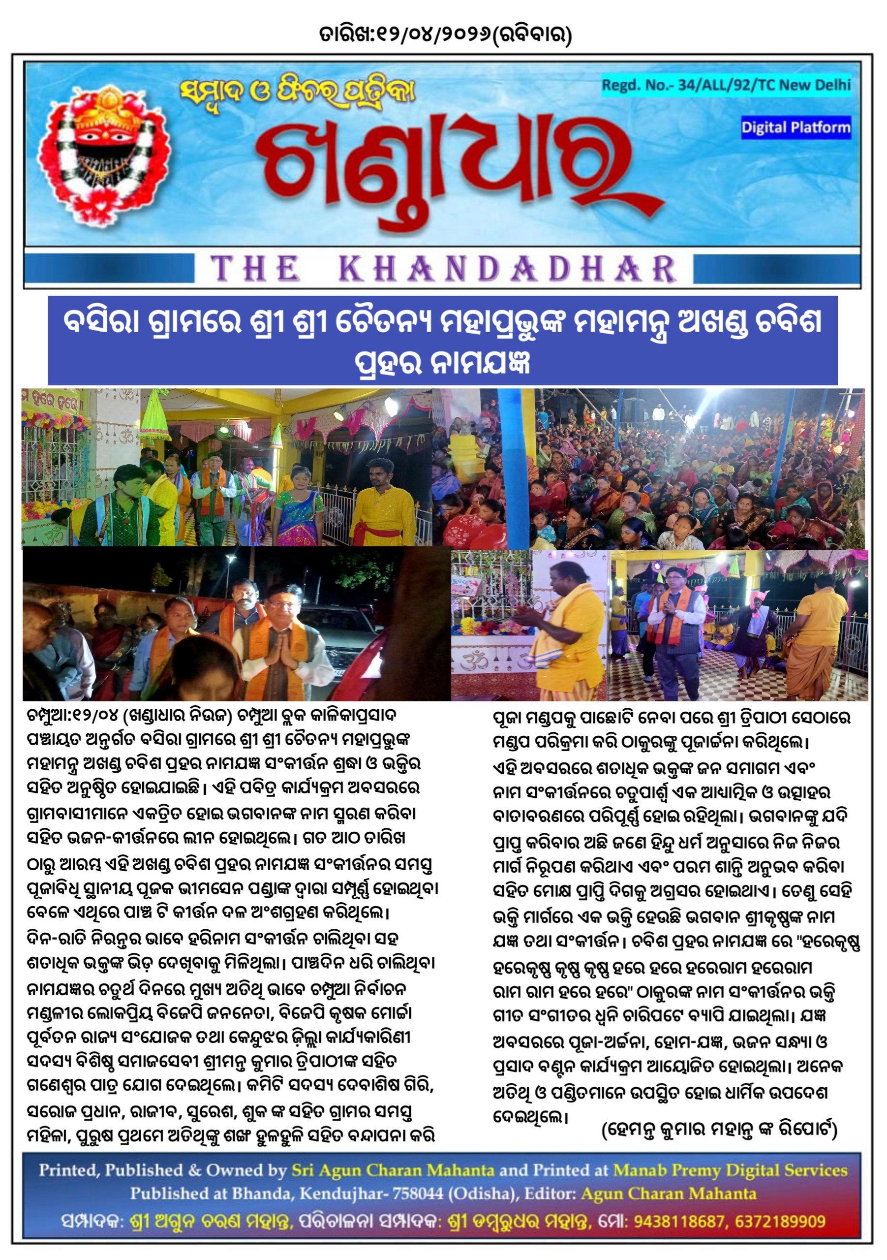 ବସିରା ଗ୍ରାମରେ ଶ୍ରୀ ଶ୍ରୀ ଚୈତନ୍ୟ ମହାପ୍ରଭୁଙ୍କ ମହାମନ୍ତ୍ର ଅଖଣ୍ଡ ଚବିଶ ପ୍ରହର ନାମଯଜ୍ଞ।