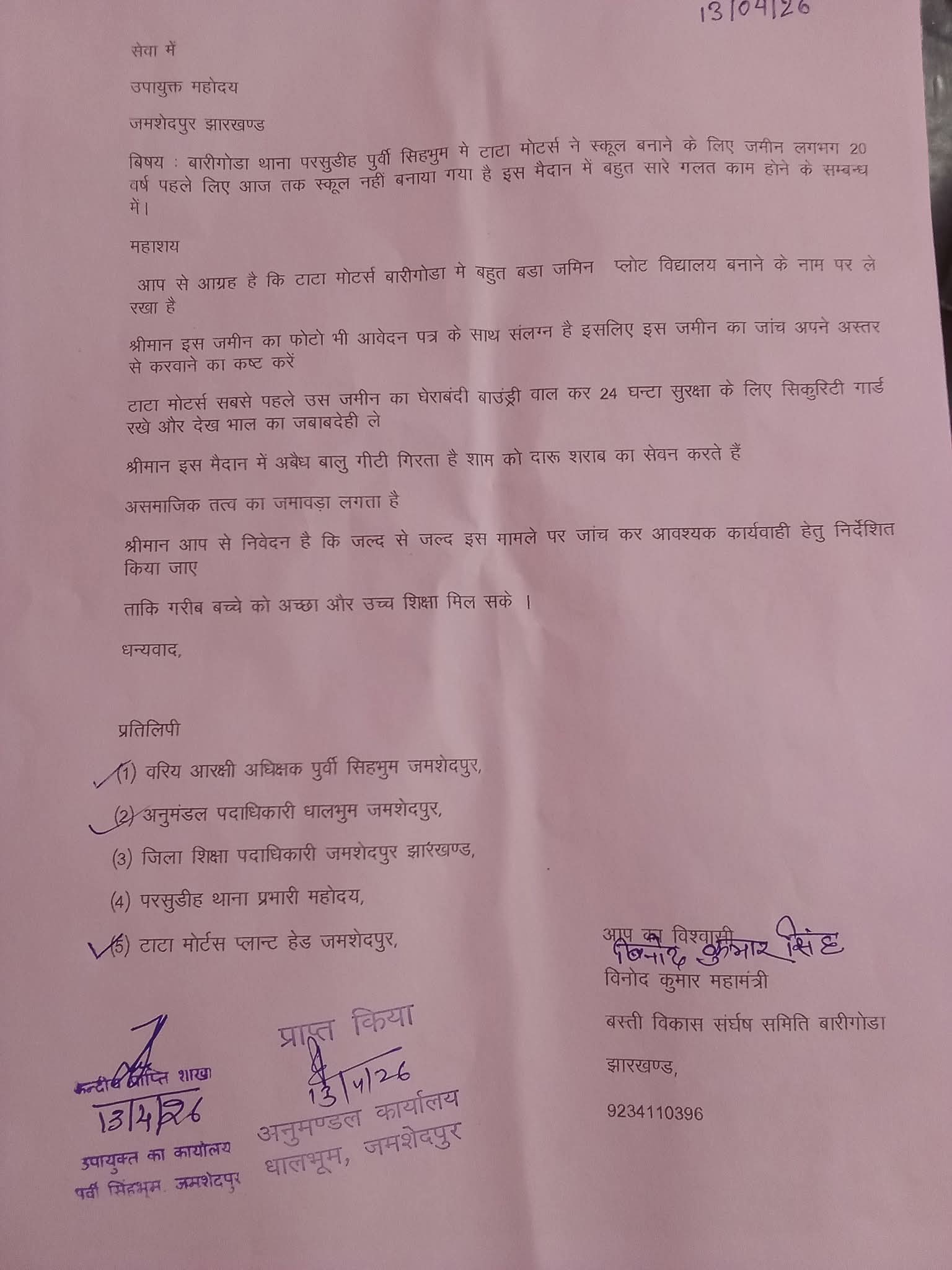 जमशेदपुर (पूर्वी सिंहभूम) परसुडीह थाना क्षेत्र के बारीगोड़ा इलाके में लगभग 20 वर्ष पहले कंपनी Tata Motors द्वारा स्कूल निर्माण के लिए ली गई जमीन आज तक खाली पड़ी है। स्थानीय लोगों का आरोप है कि इतने वर्षों बाद भी स्कूल का निर्माण नहीं होने से यह क्षेत्र अब असामाजिक गतिविधियों का केंद्र बनता जा रहा है।