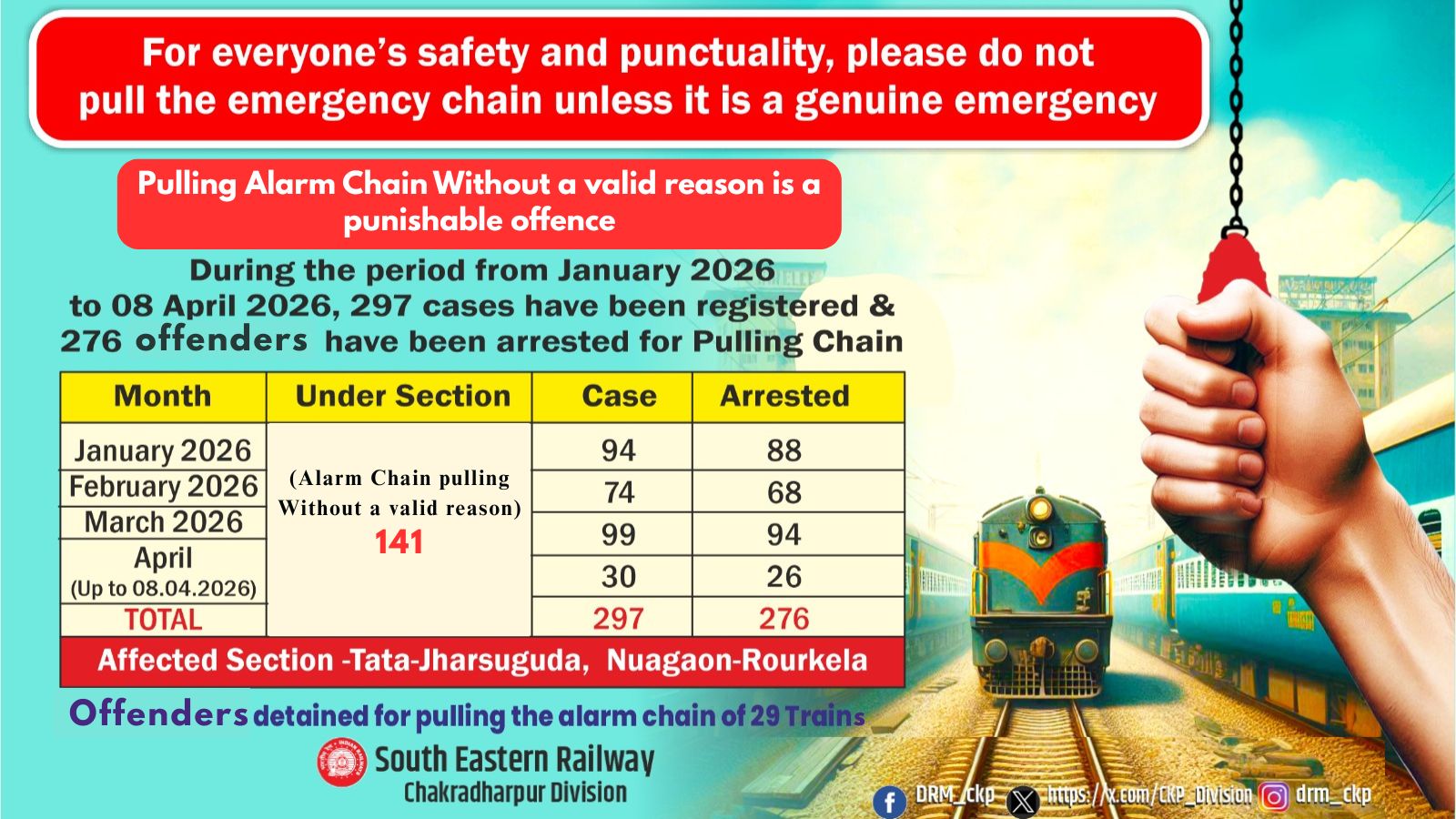 जमशेदपुर:दक्षिण पूर्व रेलवे के अंतर्गत आने वाले चक्रधरपुर मंडल में ट्रेनों की सुरक्षा और समयबद्धता को लेकर बड़ा अभियान चलाया जा रहा है। इस अभियान के तहत बिना किसी वैध कारण के ट्रेन की इमरजेंसी चेन खींचने (Alarm Chain Pulling) की घटनाओं पर सख्त कार्रवाई की जा रही है। रेलवे प्रशासन ने इसे गंभीर अपराध मानते हुए यात्रियों को चेतावनी भी जारी की है कि केवल वास्तविक आपात स्थिति में ही चेन पुलिंग करें, अन्यथा कानूनी कार्रवाई का सामना करना पड़ेगा।