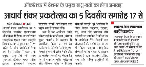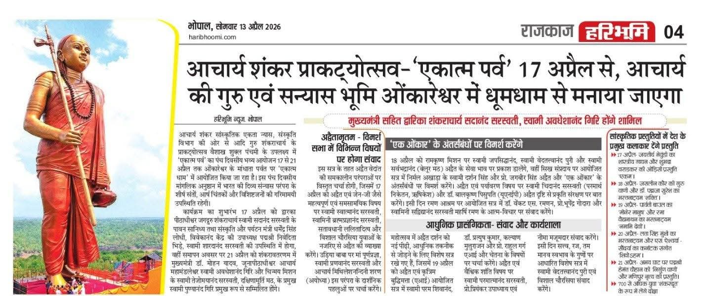 आचार्य शंकर प्रकटोत्सव : 'एकात्म पर्व' 17 अप्रैल से
