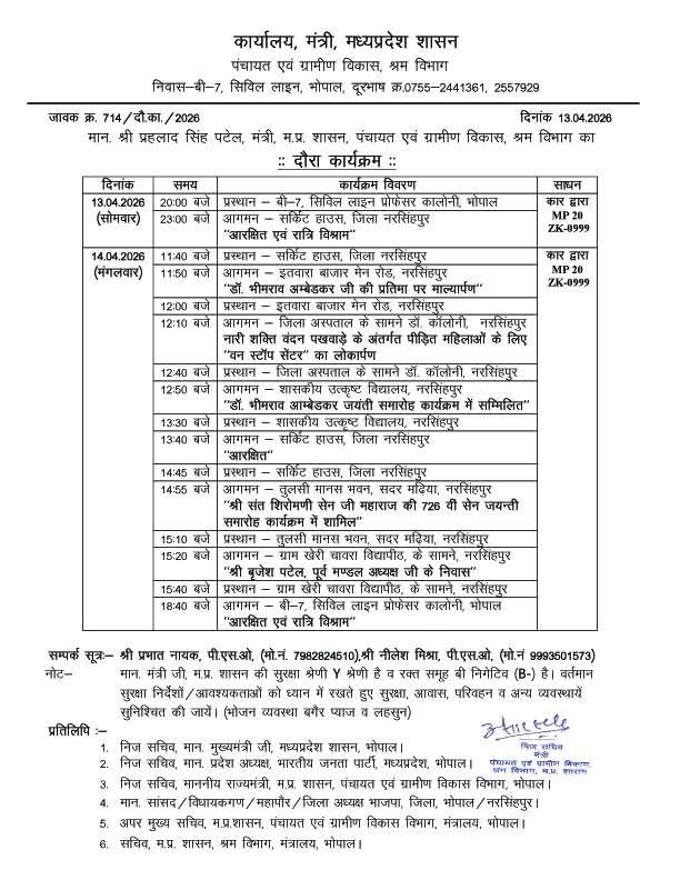मंत्री श्री प्रहलाद सिंह पटेल के 14 अप्रैल के कार्यक्रम