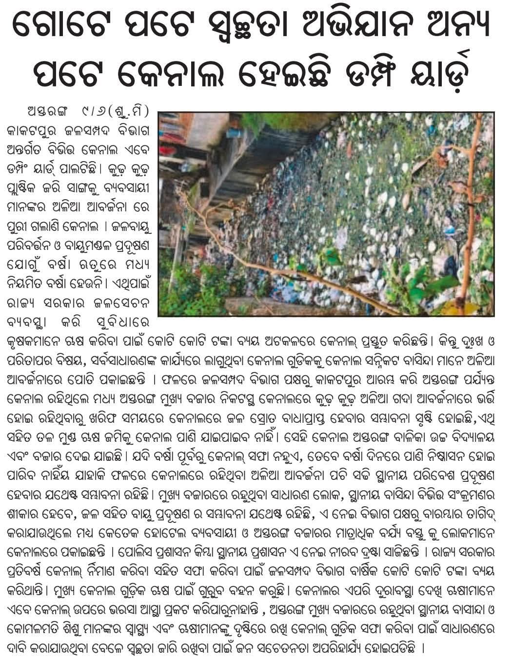 ଅସ୍ତରଙ୍ଗ, ୧୧ ଏପ୍ରିଲ: ଅସ୍ତରଙ୍ଗ ବଜାର ଦେଇ ପ୍ରବାହିତ ମୁଖ୍ୟ କେନାଲ ଏବେ ଅଳିଆ ଆବର୍ଜନାରେ ପୋତି ହୋଇଯାଉଛି। ସ୍ଥାନୀୟ ଅଭିଯୋଗ ଅନୁଯାୟୀ, ବଜାର ଅଞ୍ଚଳର କିଛି ବ୍ୟବସାୟୀ ବନ୍ଧୁ ମାନେ ପ୍ରତିଦିନ ଖାଦ୍ୟ ଅବଶିଷ୍ଟ, ପ୍ଲାଷ୍ଟିକ ପ୍ଲେଟ, ପଲିଥିନ ଓ ଅନ୍ୟାନ୍ୟ ବର୍ଜ୍ୟବସ୍ତୁ ସିଧା କେନାଲକୁ ଫିଙ୍ଗୁଛନ୍ତି।