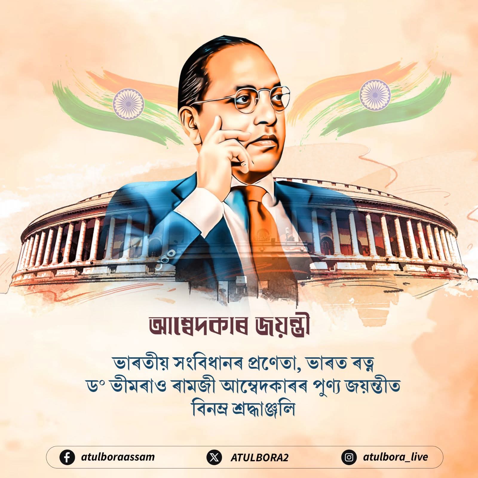 আজি পুণ্য জয়ন্তীত বাবা চাহেবক শ্ৰদ্ধাৰে সুঁৱৰিছোঁ। আমি সকলোৱে তেখেতৰ দৃষ্টিভংগী-দৰ্শন হৃদয়ংগম কৰি ৰাষ্ট্ৰ তথা সমাজৰ প্ৰগতি আৰু সুৰক্ষাৰ হকে অৱদান আগবঢ়াবলৈ বদ্ধপৰিকৰ হওঁ আহক।