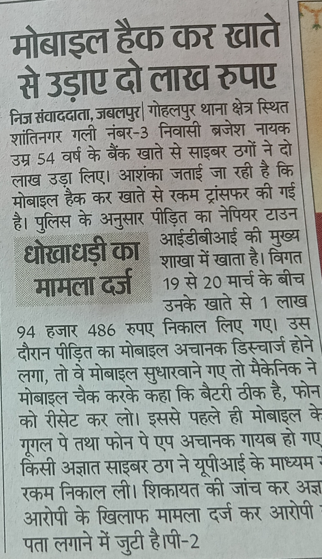 मोबाइल हैक कर खाते से उड़ाए दो लाख रुपए