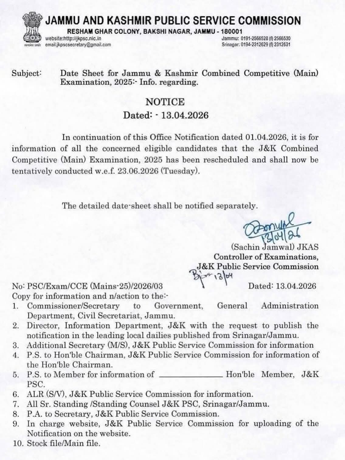 Date Sheet for Jammu and Kashmir Combined Competitive (Main) Examination, 2025