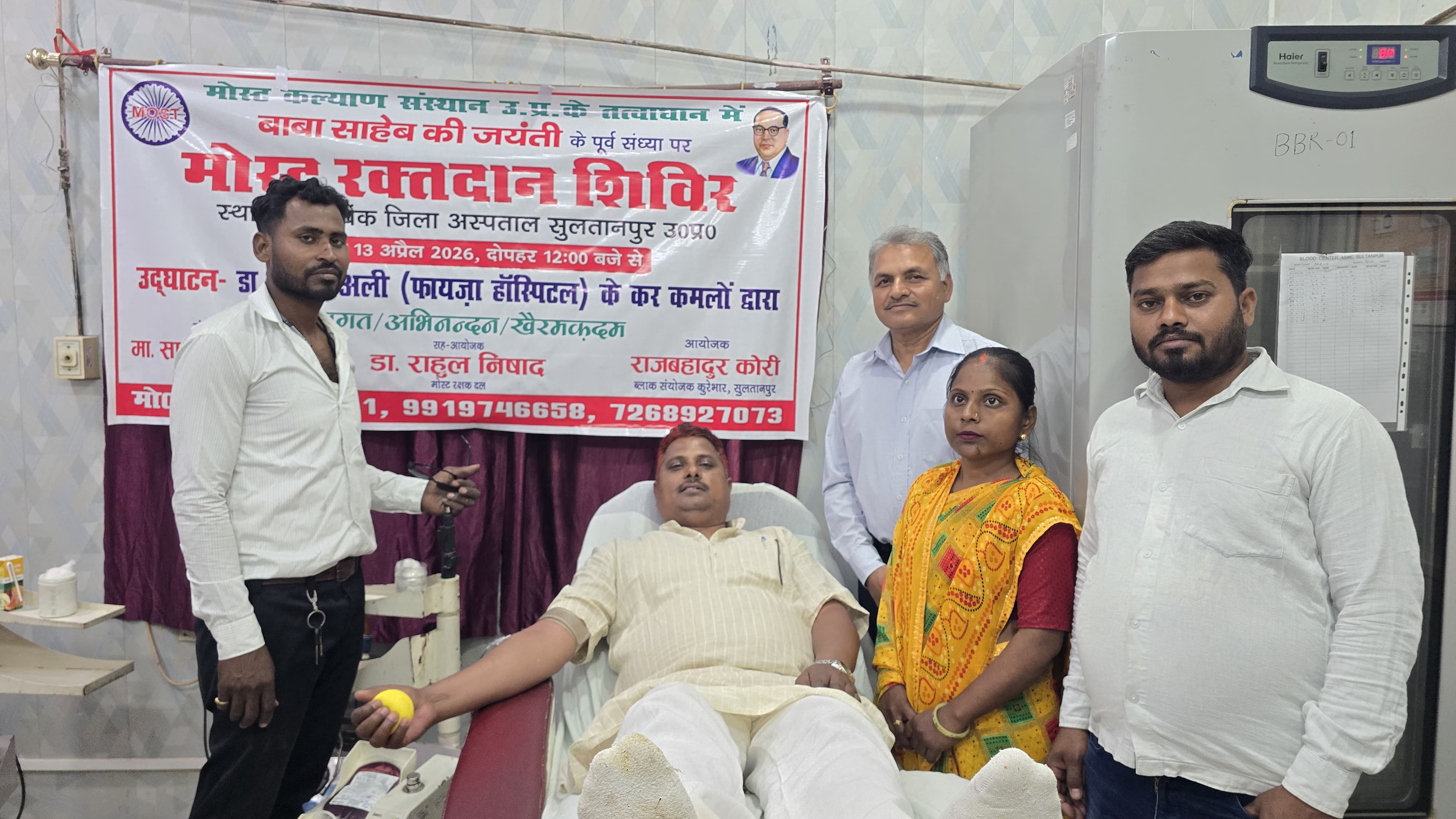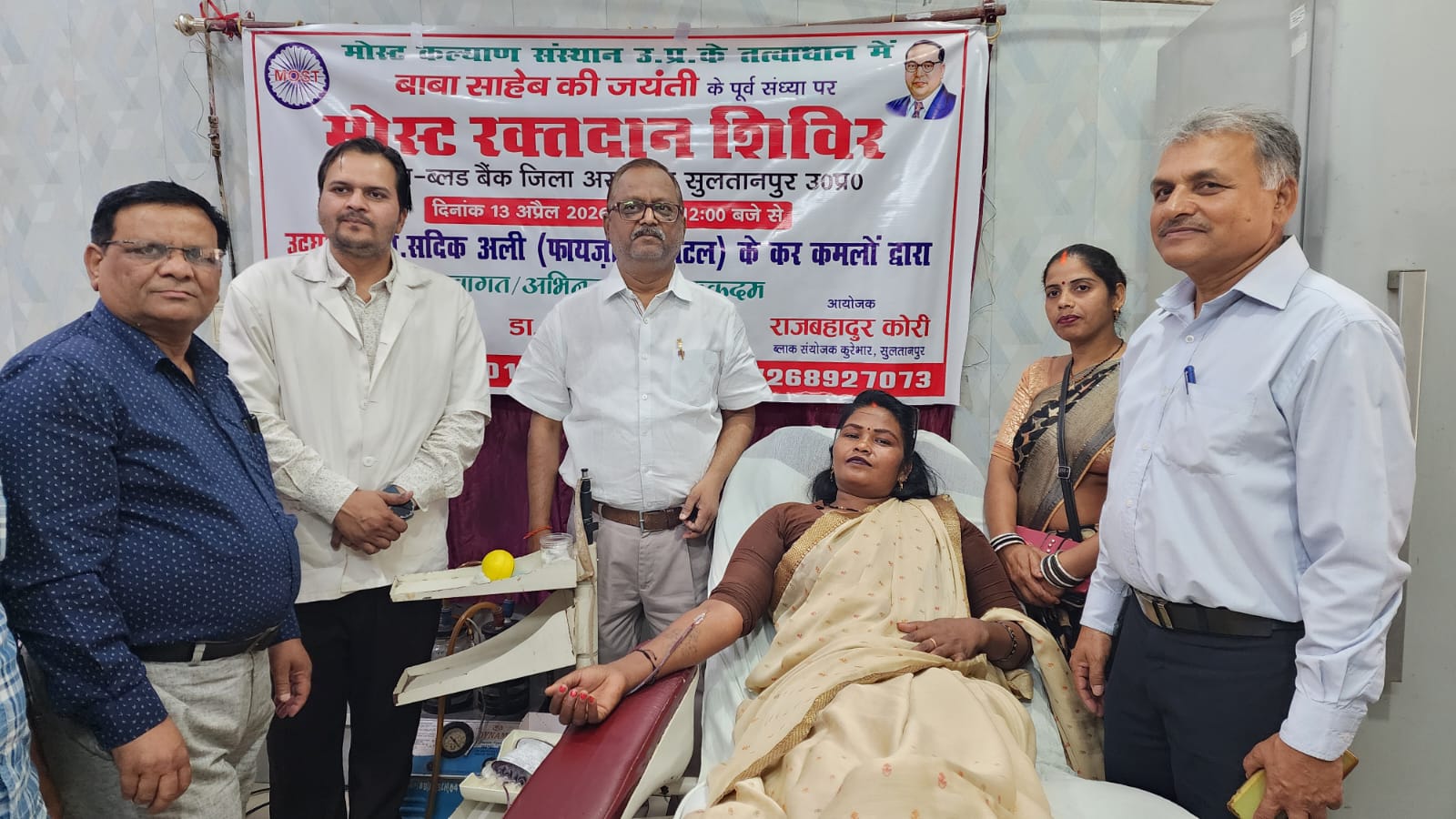 सुलतानपुर। आज दिनांक 13.04.2026 को बाबा साहब भीमराव अंबेडकर की जयंती के पूर्व संध्या पर मोस्ट कल्याण संस्थान, उत्तर प्रदेश के तत्वाधान में कूरेभार ब्लॉक संयोजक राजबहादुर कोरी व डा. राहुल निषाद के संयुक्त नेतृत्व एवं पूर्व विधायक सफदर रजा खां के संरक्षण में मेडिकल कॉलेज में रक्तदान शिविर का आयोजन किया गया। कार्यक्रम का उद्घाटन फ़ायजा हॉस्पिटल के डा. सादिक अली के द्वारा किया गया।