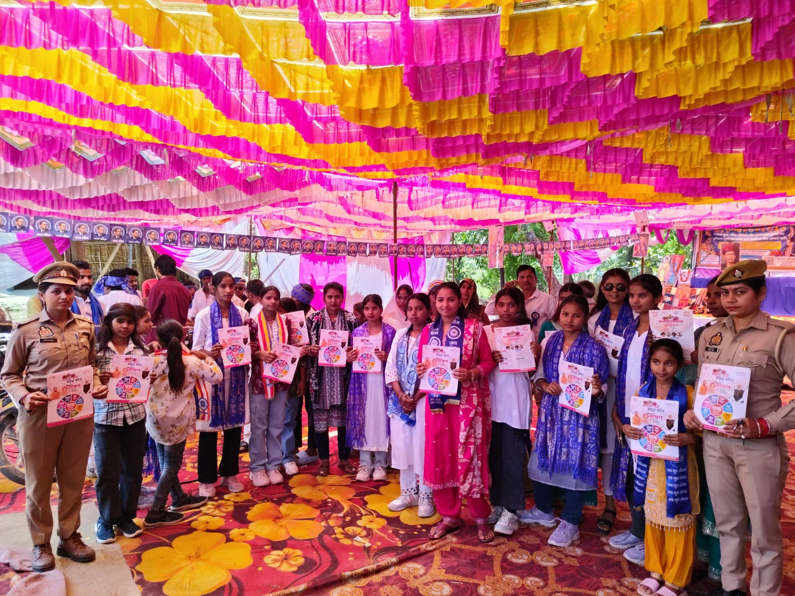 “मिशन शक्ति 5.0” अभियान के द्वितीय चरण अन्तर्गत महिलाओं की सुरक्षा और सशक्तिकरण स्वावलंबन हेतु चलाई जा रही विभिन्न विभागों की योजनाओं जैसे मुख्यमंत्री कन्या सुमंगला योजना, निराश्रित महिला पेंशन योजना, उ०प्र० राज्य ग्रामीण आजीविका मिशन, राष्ट्रीय पोषण योजना, मुख्यमंत्री सामूहिक विवाह योजना, बेटी बचाओ-बेटी पढ़ाओ, प्रधानमंत्री उज्जवला योजना, पी०एम० स्वानिधि योजना, पी०एम० सम्मान निधि योजना, वन स्टाप सेन्टर, आयुष्मान योजना, सुरक्षित मातृत्व आश्वासन सुमन योजना, महिला शक्ति केन्द्र योजना, मुख्यमंत्री अभ्युदय योजना, कन्या सुमंगला योजना तथा पुलिस विभाग से संबंधित विभिन्न हेल्पलाइन नंबरों वीमेन पावर लाइन 1090, पुलिस आपातकालीन सेवा-112 इमरजेन्सी कॉल/पैनिक बटन-मोबाइल पर डेमो, सी०एम० हेल्प लाइन 1076, स्वास्थ्य सेवा हेल्प लाइन-102, एम्बुलेंस सेवा-108, महिला हेल्प लाईन-181, साइबर क्राइम हेल्पलाइन 1930 आदि के बारे मे पंपलेट बांटकर जागरूक किया गया।