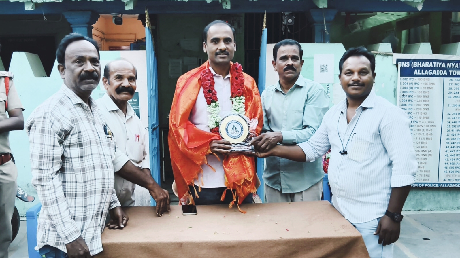 AIMA న్యూస్. నంద్యాల జిల్లా ఆళ్లగడ్డ టౌన్ సర్కిల్ ఇన్‌స్పెక్టర్ (సీఐ)గా విధులు నిర్వహించి, బదిలీపై వెళ్తున్న యుగంధర్ ను ఆళ్లగడ్డ వర్కింగ్ జర్నలిస్టులు మర్యాదపూర్వకంగా కలిసి ఘనంగా సత్కరించారు. మంగళవారం సాయంత్రం స్థానిక పోలీస్ స్టేషన్‌లో జరిగిన ఈ కార్యక్రమంలో జర్నలిస్టులు ఆయనకు శాలువా కప్పి, పూలమాలలతో గౌరవించి వీడ్కోలు పలికారు.ఈ సందర్భంగా ఏపీ జర్నలిస్ట్ యూనియన్ జిల్లా కార్యదర్శి ప్రసాద్ రాయల్ మాట్లాడుతూ ఆళ్లగడ్డలో సీఐ యుగంధర్ పనిచేసిన కాలం ఎంతో ప్రశాంతంగా సాగిందని. శాంతిభద్రతల పరిరక్షణలో ఆయన చూపిన చొరవ, ప్రజల సమస్యల పట్ల స్పందించిన తీరు అభినందనీయమని.విధి నిర్వహణలో నిక్కచ్చిగా ఉంటూనే, అందరితో స్నేహపూర్వకంగా ఉండేవారని వారు గుర్తు చేసుకున్నారు.సత్కారం అందుకున్న అనంతరం సీఐ యుగంధర్ మాట్లాడుతూ. ఆళ్లగడ్డలో తన పదవీ కాలం సంతృప్తిని ఇచ్చిందని పోలీసు శాఖకు, ప్రజలకు మధ్య వారధిలా నిలుస్తూ మీడియా ప్రతినిధులు అందించిన సహకారం మరువలేనిదని ఆయన కృతజ్ఞతలు తెలిపారు. సమాజ హితం కోసం జర్నలిస్టులు ఇదే స్ఫూర్తితో పనిచేయాలని ఆయన కోరారు.ఈ కార్యక్రమంలో ఏపీ జర్నలిస్ట్ యూనియన్ జిల్లా కార్యదర్శి ప్రసాద్ రాయల్, జర్నలిస్టులు అక్షింతల శ్రీనివాసులు, కేఎల్ మోహన్ రెడ్డి, అరుణ్ (99 టీవీ), విల్సన్ (AM న్యూస్), రాజ్ కుమార్ (ప్రైమ్ 9 టీవీ) తదితరులు పాల్గొన్నారు.
