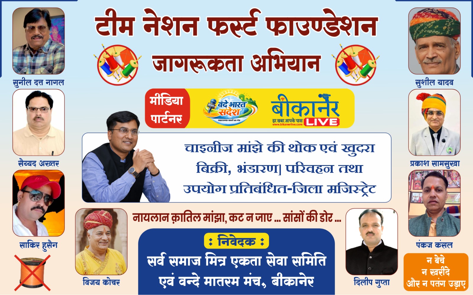 बीकानेर, 15 अप्रैल।टीम नेशन फर्स्ट फाउंडेशन एवं मित्र एकता सेवा समिति के संयुक्त तत्वावधान में चाइनीज मांझे के बहिष्कार एवं इसके उपयोग पर रोक लगाने के उद्देश्य से बुधवार को संभागीय आयुक्त कार्यालय में बैनर का विमोचन किया गया। इस अवसर पर संभागीय आयुक्त श्री विश्राम मीणा ने बैनर जारी कर अभियान की शुरुआत की।