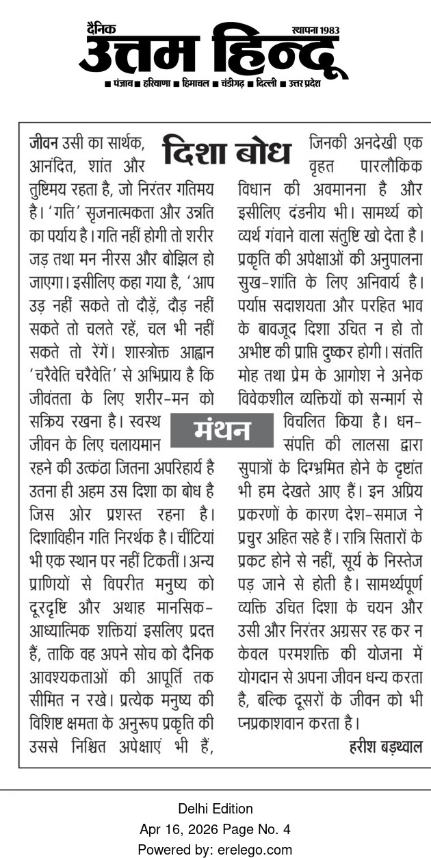 ​स्वस्थ जीवन के लिए सक्रियता जितनी जरूरी है, उतना ही महत्वपूर्ण है 'दिशा बोध' यानी यह जानना कि हम किस ओर जा रहे हैं। बिना किसी निश्चित दिशा के की गई गति निरर्थक होती है। प्रकृति ने मनुष्य को दूरदृष्टि और असीमित मानसिक व आध्यात्मिक शक्तियाँ इसीलिए दी हैं, ताकि वह केवल अपनी दैनिक जरूरतों (रोटी, कपड़ा, मकान) तक सीमित न रहे, बल्कि अपने जीवन के उच्च उद्देश्यों को पहचाने।