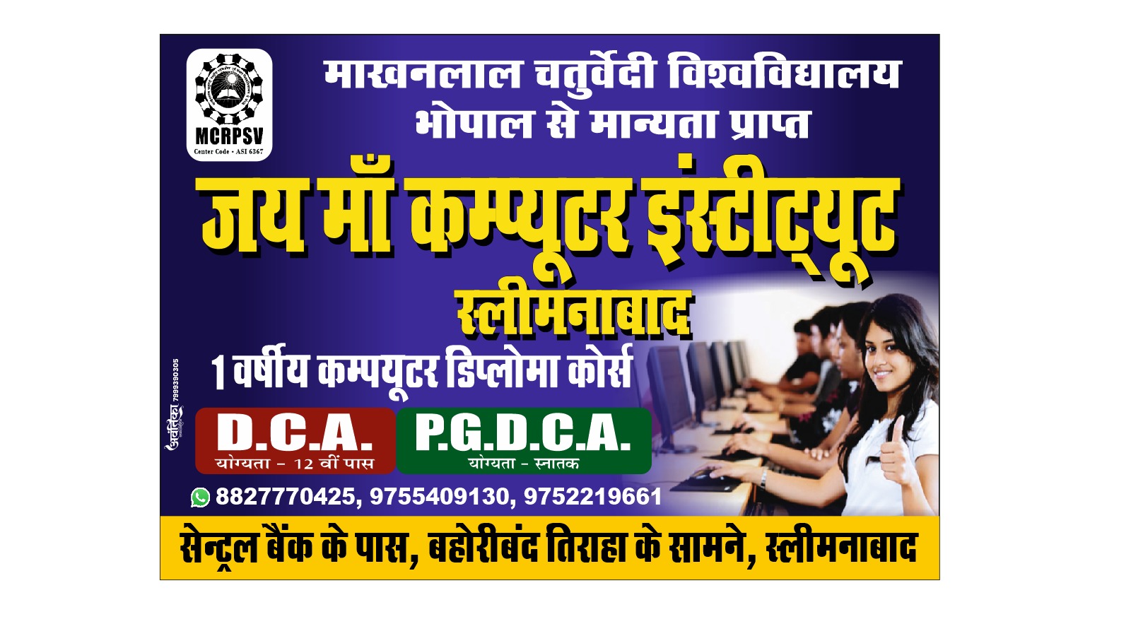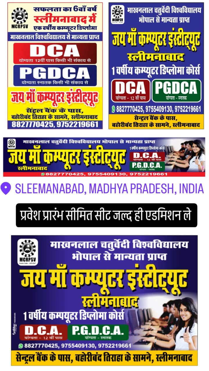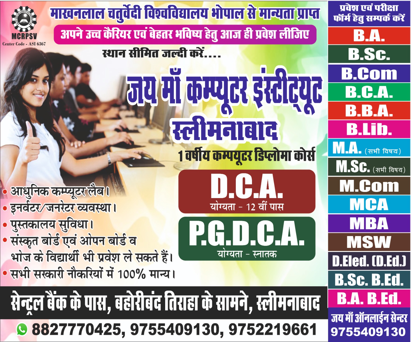 рдХрдВрдкреНрдпреВрдЯрд░ рдЯреАрдЪрд░ рдХреА DCA/PGDCA рдкрдврд╝рд╛рдиреЗ рд╣реЗрддреБ рдпреЛрдЧреНрдпрддрд╛:- BCA, BE, MSC(cs), MCA, PGDCA рд╡реЗрддрди:- рдпреЛрдЧреНрдпрддрд╛рдиреБрд╕рд╛рд░ рд╕рдВрдкрд░реНрдХ рдХрд░реЗ:- рдЬрдп рдорд╛рдВ рдХрдВрдкреНрдпреВрдЯрд░ рдХреЙрд▓реЗрдЬ рд╕реНрд▓реАрдордирд╛рдмрд╛рдж рдЬрд┐рд▓рд╛ рдХрдЯрдиреА