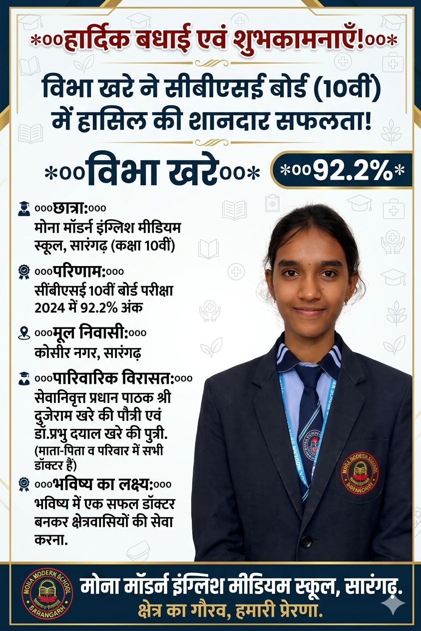 सारंगढ़/कोसीर: सीबीएसई बोर्ड परीक्षा में इस वर्ष विभा खरे ने 92.2% अंक प्राप्त कर शानदार सफलता हासिल की है। उनकी इस उपलब्धि से पूरे क्षेत्र में खुशी और गर्व का माहौल है। वर्तमान में विभा, मोना मॉडर्न इंग्लिश मीडियम स्कूल, सारंगढ़ में कक्षा10वीं की छात्रा हैं।