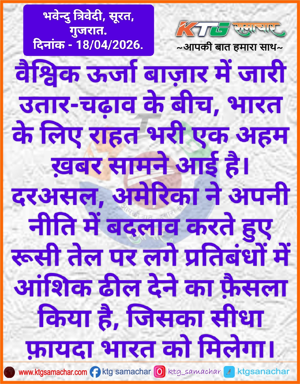 वैश्विक ऊर्जा बाजार में जारी उतार-चढ़ाव के बीच भारत के लिए राहत भरी खबर।