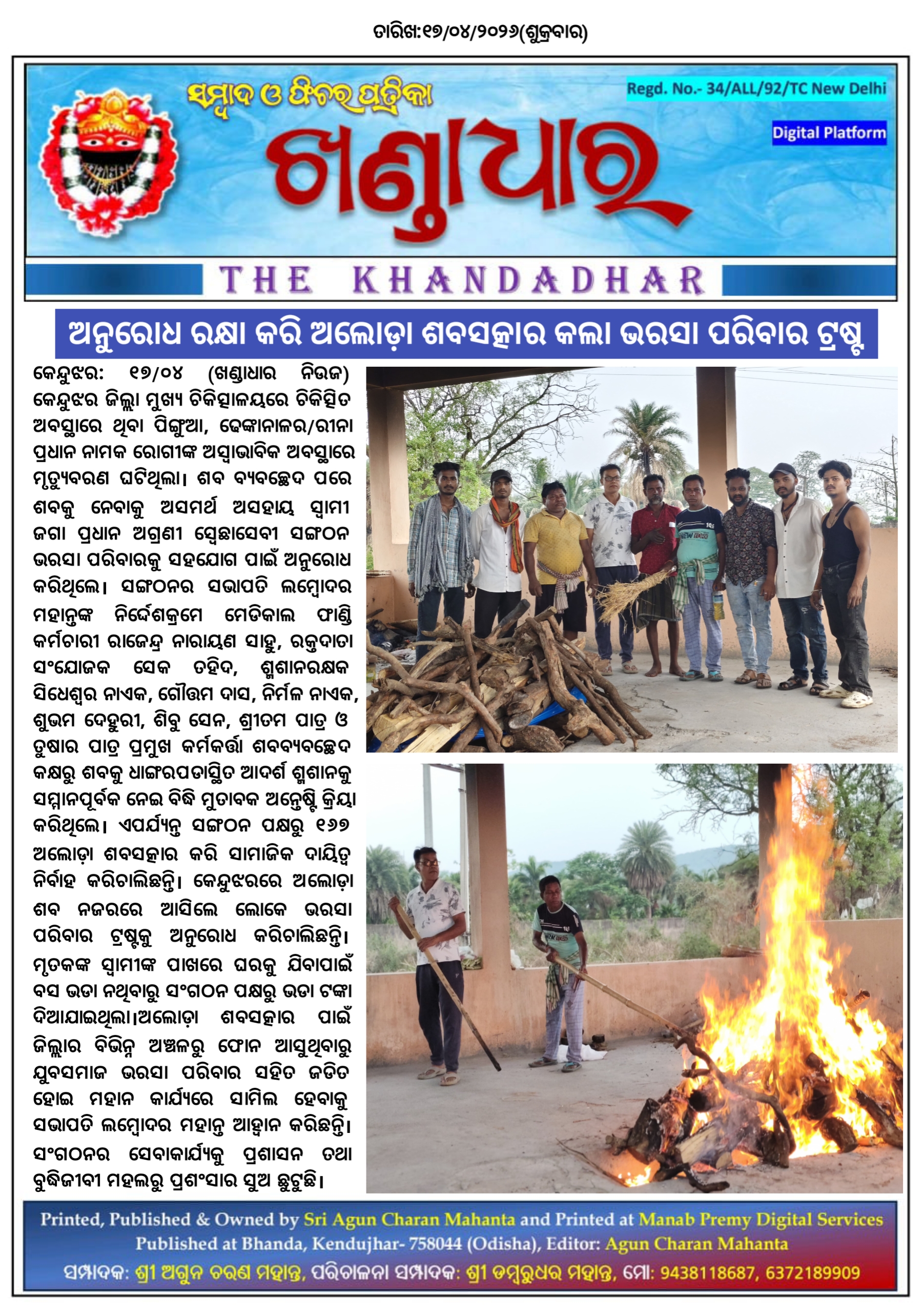 ଅନୁରୋଧ ରକ୍ଷା କରି ଅଲୋଡ଼ା ଶବସତ୍କାର କଲା ଭରସା ପରିବାର ଟ୍ରଷ୍ଟ।