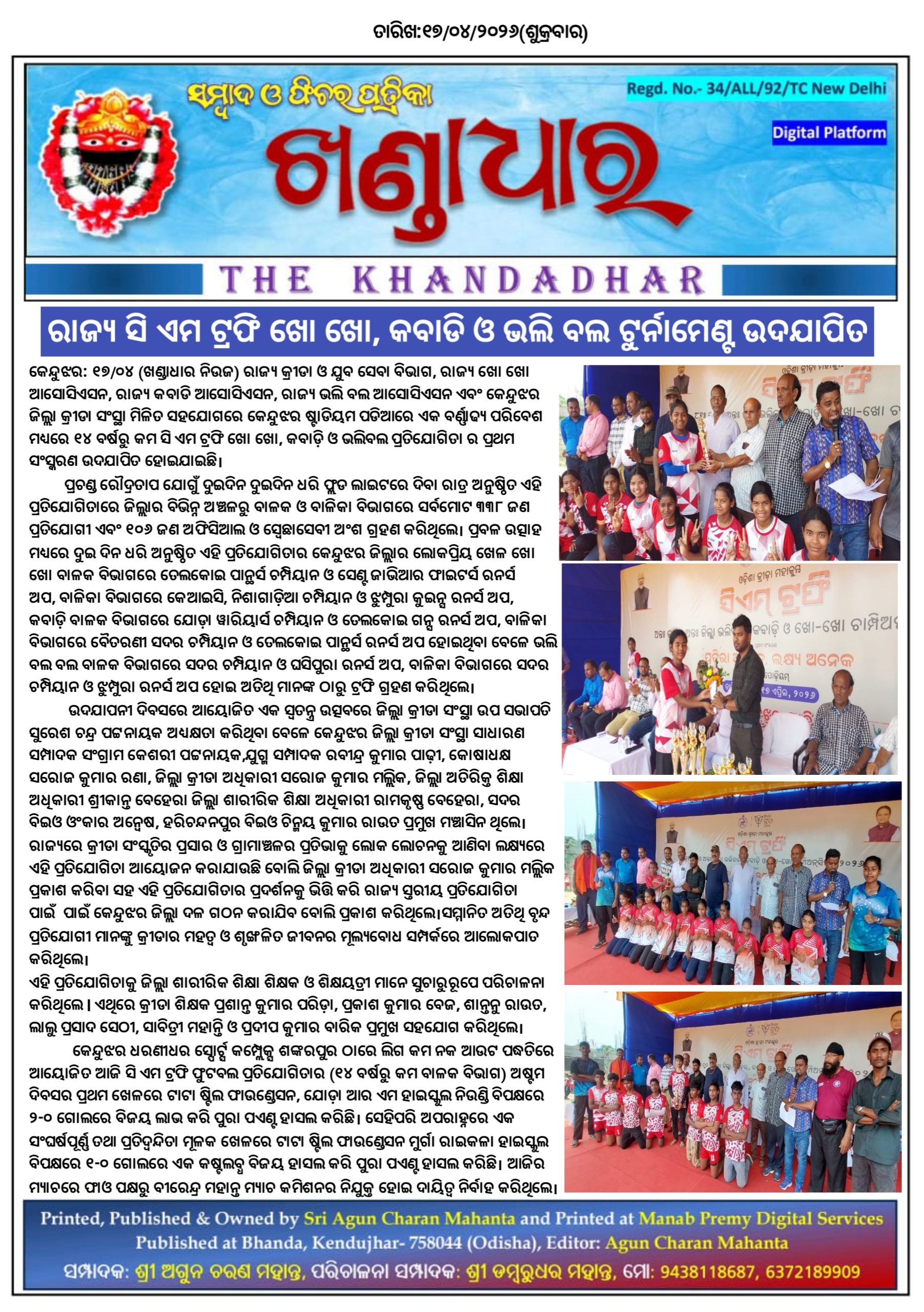 କେନ୍ଦୁଝର - ୧୭/୦୪(ଖଣ୍ଡାଧାର ନିଉଜ) ରାଜ୍ୟ କ୍ରୀଡା ଓ ଯୁବ ସେବା ବିଭାଗ, ରାଜ୍ୟ ଖୋ ଖୋ ଆସୋସିଏସନ, ରାଜ୍ୟ କବାଡି ଆସୋସିଏସନ, ରାଜ୍ୟ ଭଲି ବଲ ଆସୋସିଏସନ ଏବଂ କେନ୍ଦୁଝର ଜିଲ୍ଲା କ୍ରୀଡା ସଂସ୍ଥା ମିଳିତ ସହଯୋଗରେ କେନ୍ଦୁଝର ଷ୍ଟାଡିୟମ ପଡିଆରେ ଏକ ବର୍ଣ୍ଣାଢ୍ୟ ପରିବେଶ ମଧ୍ୟରେ ୧୪ ବର୍ଷରୁ କମ ସି ଏମ ଟ୍ରଫି ଖୋ ଖୋ, କବାଡ଼ି ଓ ଭଲିବଲ ପ୍ରତିଯୋଗିତା ର ପ୍ରଥମ ସଂସ୍କରଣ ଉଦଯାପିତ ହୋଇଯାଇଛି l