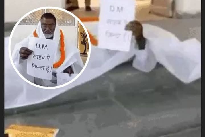 प्रशासनिक लापरवाही की पराकाष्ठा: खुद को जिंदा साबित करने के लिए बुजुर्ग ने ओढ़ा कफन, डीएम दफ्तर में मचा हड़कंप