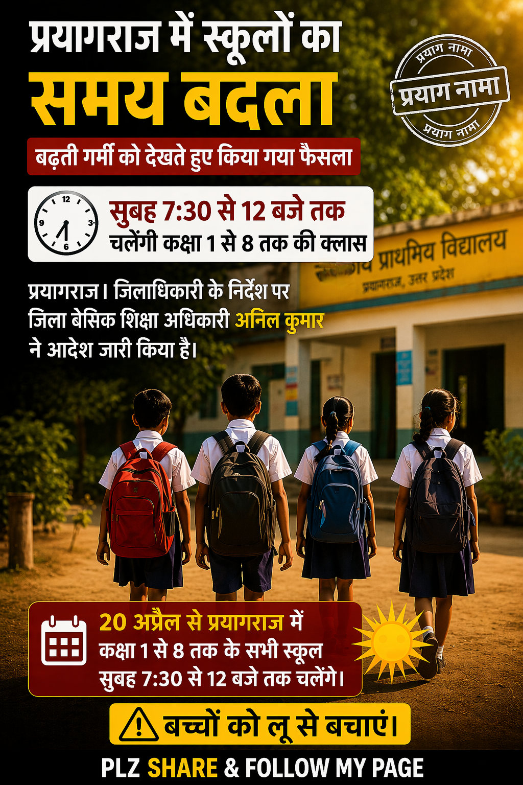 "20 अप्रैल से प्रयागराज में कक्षा 1 से 8 तक के सभी स्कूल सुबह 7:30 से 12 बजे तक चलेंगे। बच्चों को लू से बचाएं।"