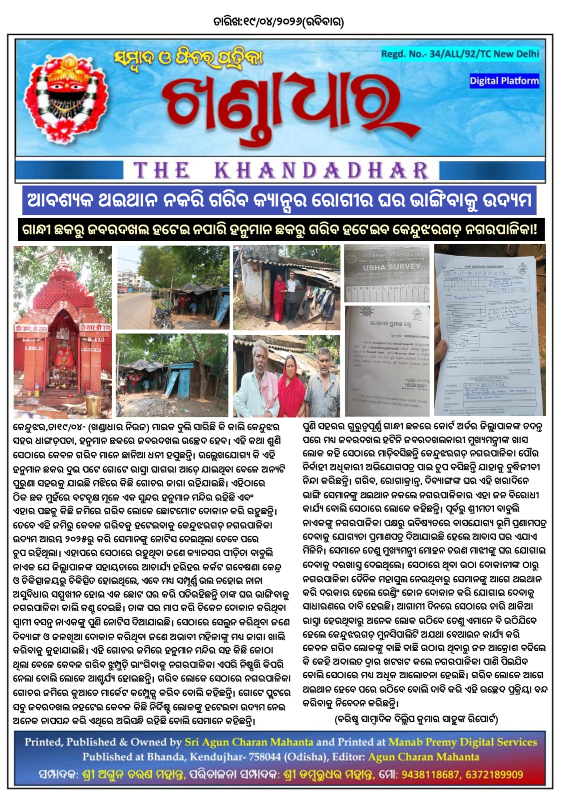 ଆବଶ୍ୟକ ଥଇଥାନ ନକରି ଗରିବ କ୍ୟାନ୍ସର ରୋଗୀର ଘର ଭାଙ୍ଗିବାକୁ ଉଦ୍ୟମ। ଗାନ୍ଧୀ ଛକରୁ ଜବରଦଖଲ ହଟେଇ ନପାରି ହନୁମାନ ଛକରୁ ଗରିବ ହଟେଇବ କେନ୍ଦୁଝରଗଡ଼ ନଗରପାଳିକା!