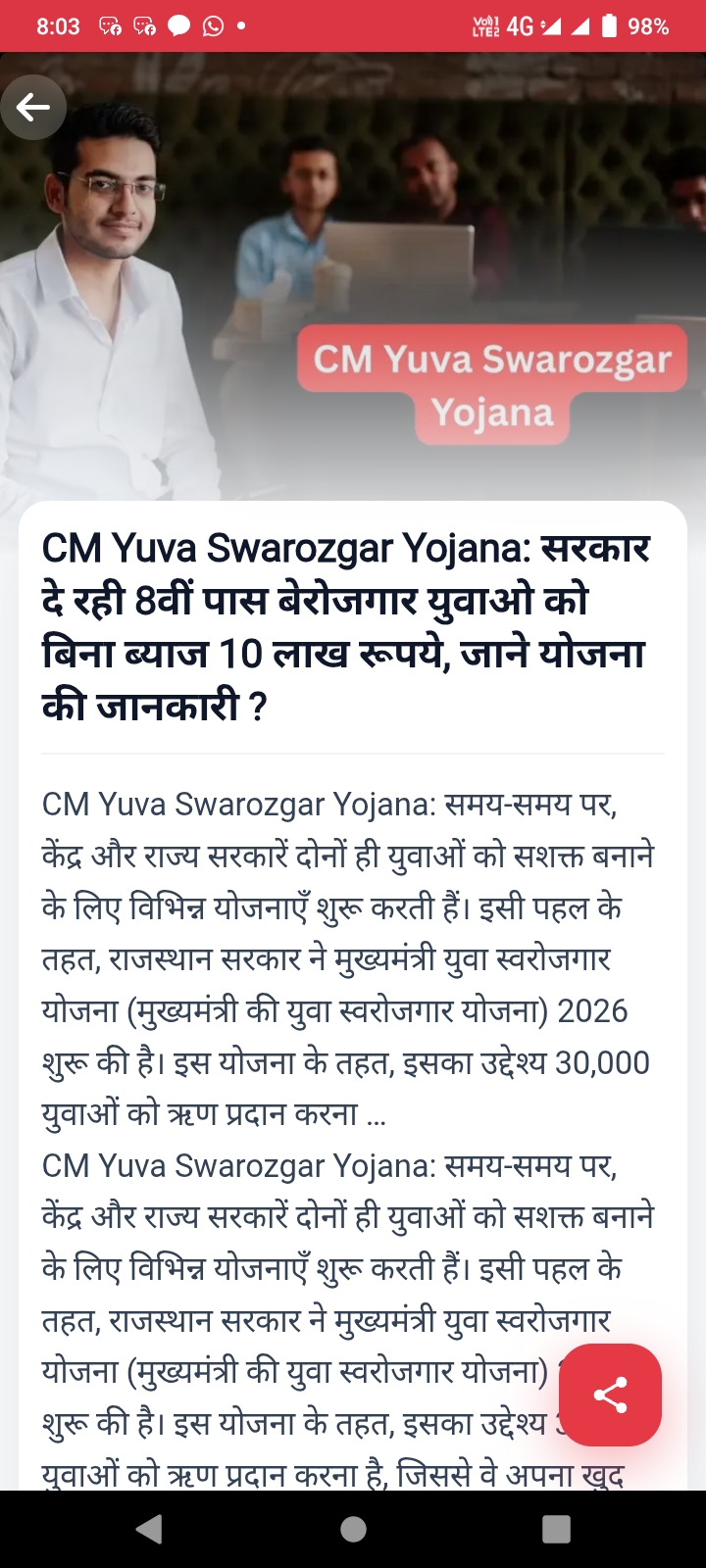 CM Yuva Swarozgar Yojana: सरकार दे रही 8वीं पास बेरोजगार युवाओ को बिना ब्याज 10 लाख रूपये, जाने योजना की जानकारी ?