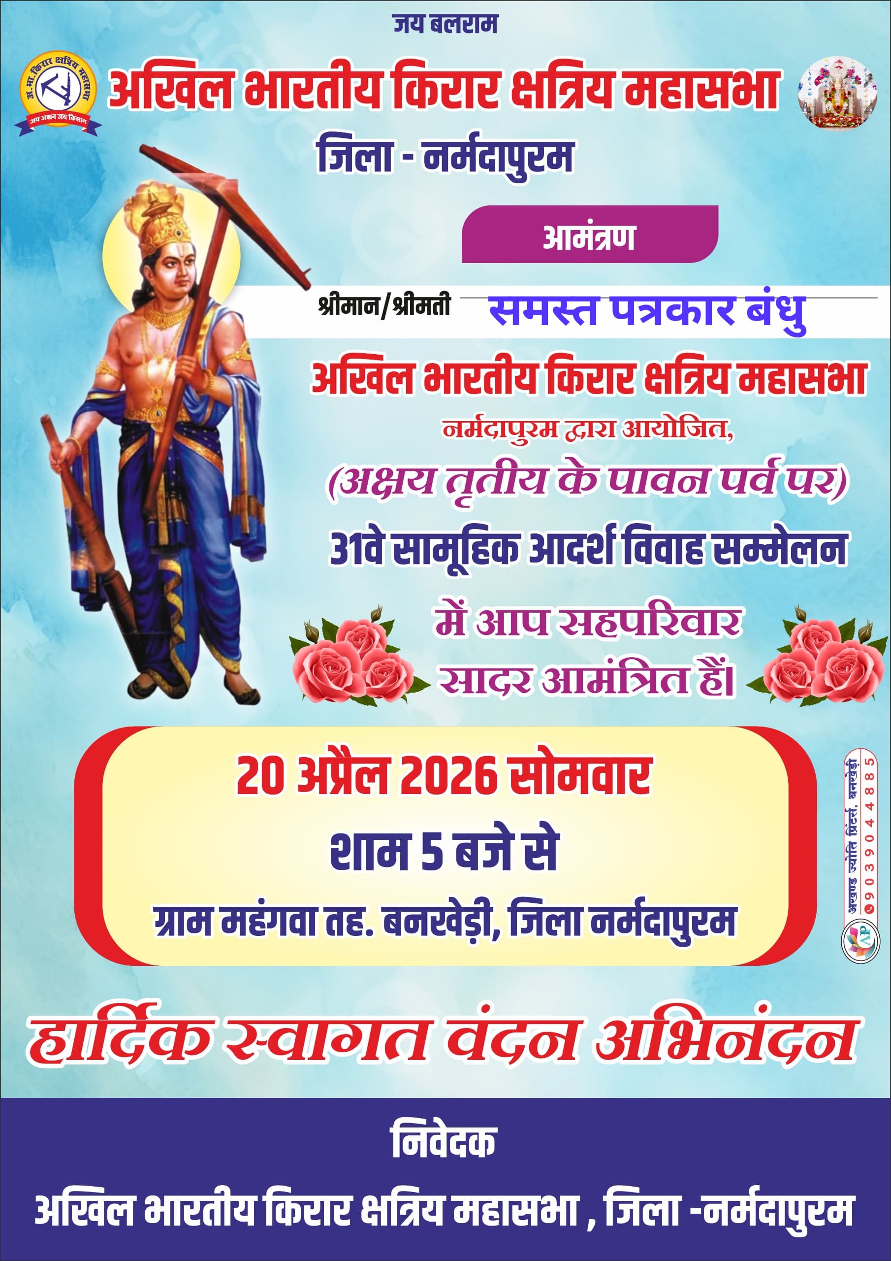 बनखेड़ी/नर्मदापुरम: 20 अप्रैल को अखिल भारतीय किरार क्षत्रिय महासभा नर्मदापुरम के तत्वाधान में अक्षय तृतीया के शुभ मुहूर्त पर ग्राम महंगवा में सामूहिक आदर्श विवाह सम्मेलन का भव्य आयोजन किया गया । जिसमें तीन जिलों के 48 जोड़े वैवाहिक परिणय सूत्र में बंधें ।