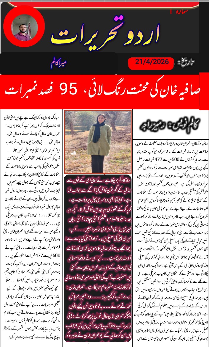 صافیہ کوثر صاحبزادی عمران خان ساکنہ دبڑاج ساگرہ بلاک منکوٹ، ہیڈ کوارٹر تحصیل مینڈھر، نے 95 فصد نمبرات حاصل کرکے اساتذہ ،والدین اور قوم کا سر فخر سے