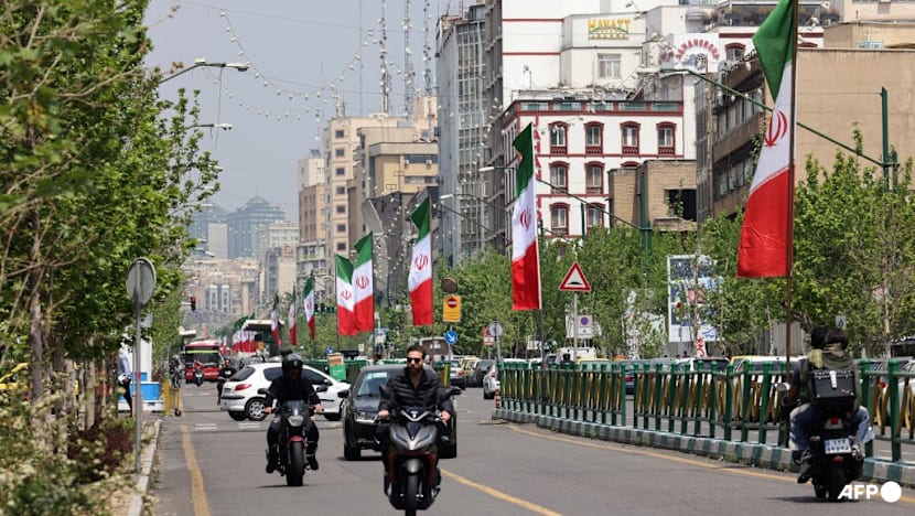 Vehicles and motorbikes drive along a street adorned with the Iranian flag, in Tehran on Apr 21 2026, amid a ceasefire in the region. (Photo: AFP/ATTA KENARE)