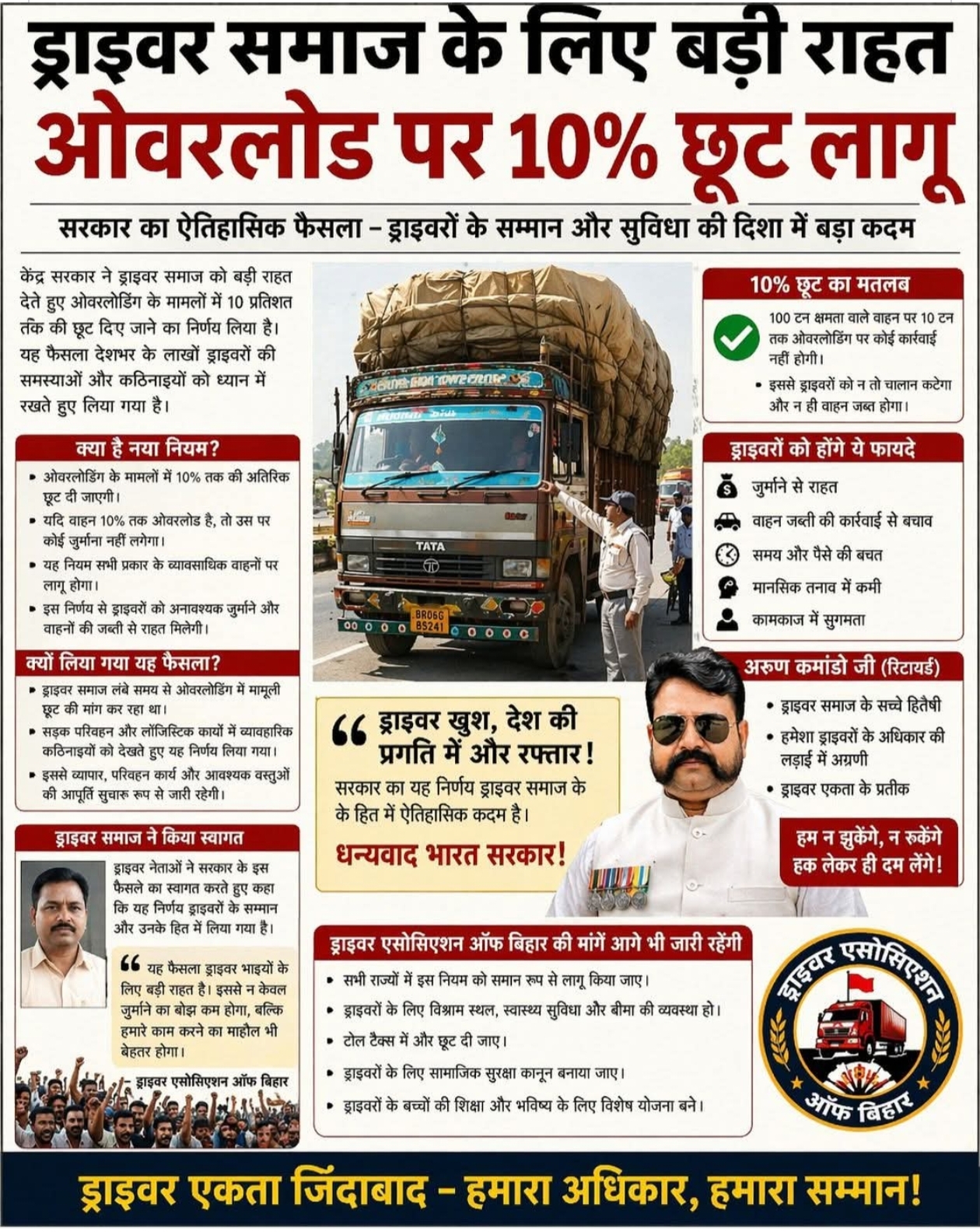 गाड़ी मालिक और ड्राइवर के लिए एक राहत भरी खबर केंद्र सरकार ने 10% ओवरलोड की छूट दिया है जो यह एक ऐतिहासिक फैसला है