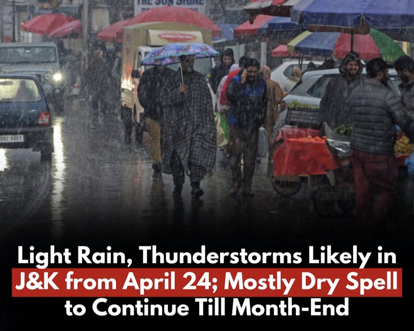 | The Meteorological Centre Srinagar has forecast largely stable weather conditions across Jammu and Kashmir till the end of April, with only brief spells of rain and thunderstorms expected on select days.