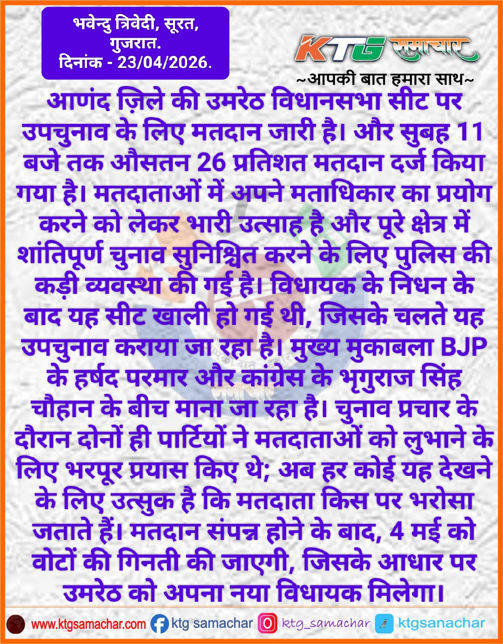 गुजरात के आणंद जिले की उमरेठ विधानसभा बैठक पर उपचुनाव के लिए मतदान जारी है।
