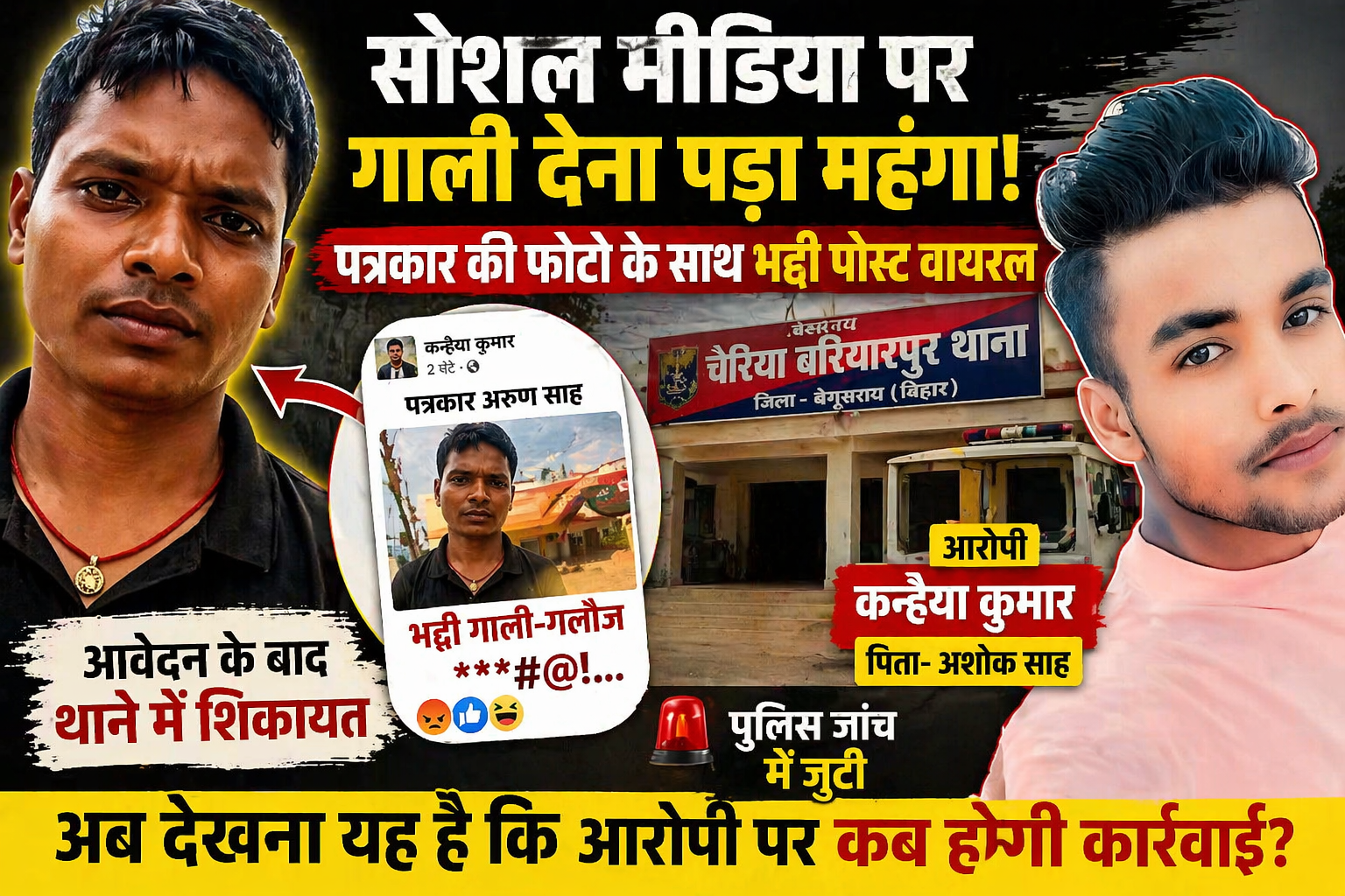 इस मामले में आरोपी की पहचान कन्हैया कुमार (पिता—अशोक साह) के रूप में की गई है। स्थानीय लोगों के मुताबिक, आरोपी युवक पिछले कुछ दिनों से लगातार फेसबुक पर आपत्तिजनक पोस्ट कर रहा था और पत्रकारों के खिलाफ अशोभनीय टिप्पणियां कर रहा था।