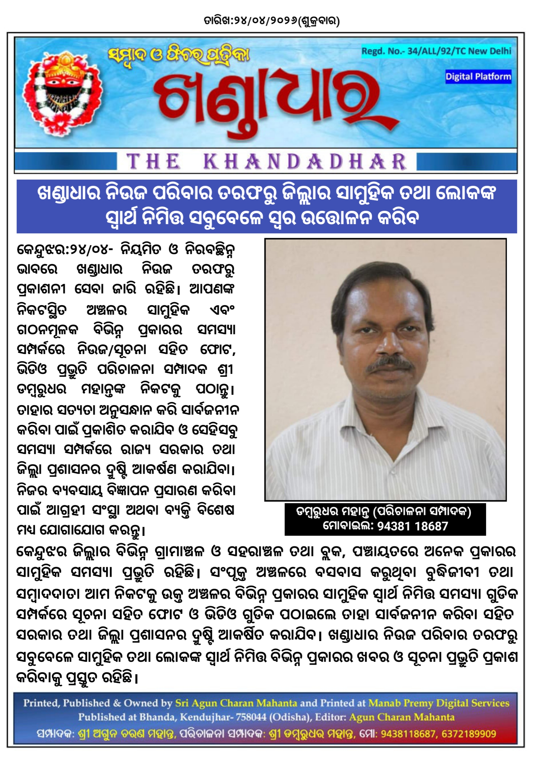 ଖଣ୍ଡାଧାର ନିଉଜ ପରିବାର ତରଫରୁ ଜିଲ୍ଲାର ସାମୁହିକ ତଥା ଲୋକଙ୍କ ସ୍ବାର୍ଥ ନିମିତ୍ତ ସବୁବେଳେ ସ୍ବର ଉତ୍ତୋଳନ କରିବ।