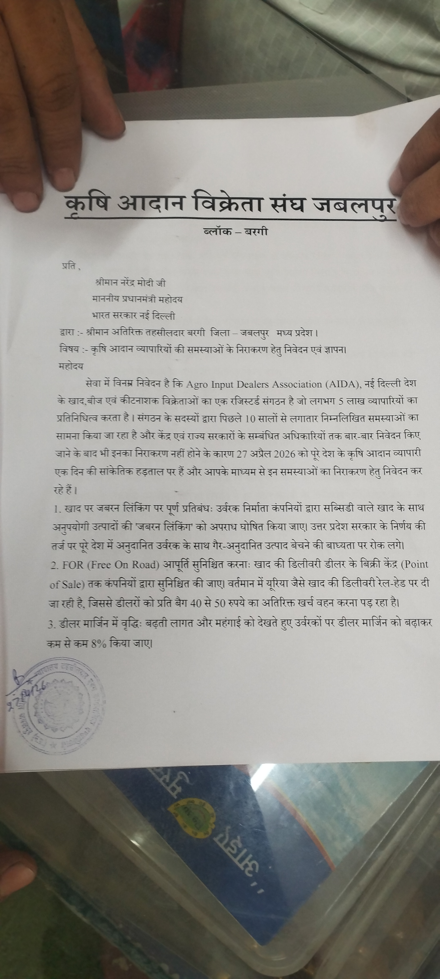 इनपुट डीलर्स एसोसिएशन (एआईडीए), नई दिल्ली देश के उर्वरक, बीज और कीटनाशक विक्रेताओं का एक पंजीकृत संगठन है जो लगभग 5 लाख व्यापारियों का प्रतिनिधित्व करता है। संगठन के सदस्य पिछले 10 वर्षों से लगातार निम्नलिखित समस्याओं का सामना कर रहे हैं और केंद्र और राज्य सरकारों के संबंधित अधिकारियों से बार-बार अनुरोध करने के बावजूद, समाधान न होने के कारण, 27 अप्रैल, 2026 को, पूरे देश के कृषि इनपुट व्यापारी एक दिन की प्रतीकात्मक हड़ताल पर हैं और इन समस्याओं के समाधान के लिए आपके माध्यम से अनुरोध कर रहे हैं।