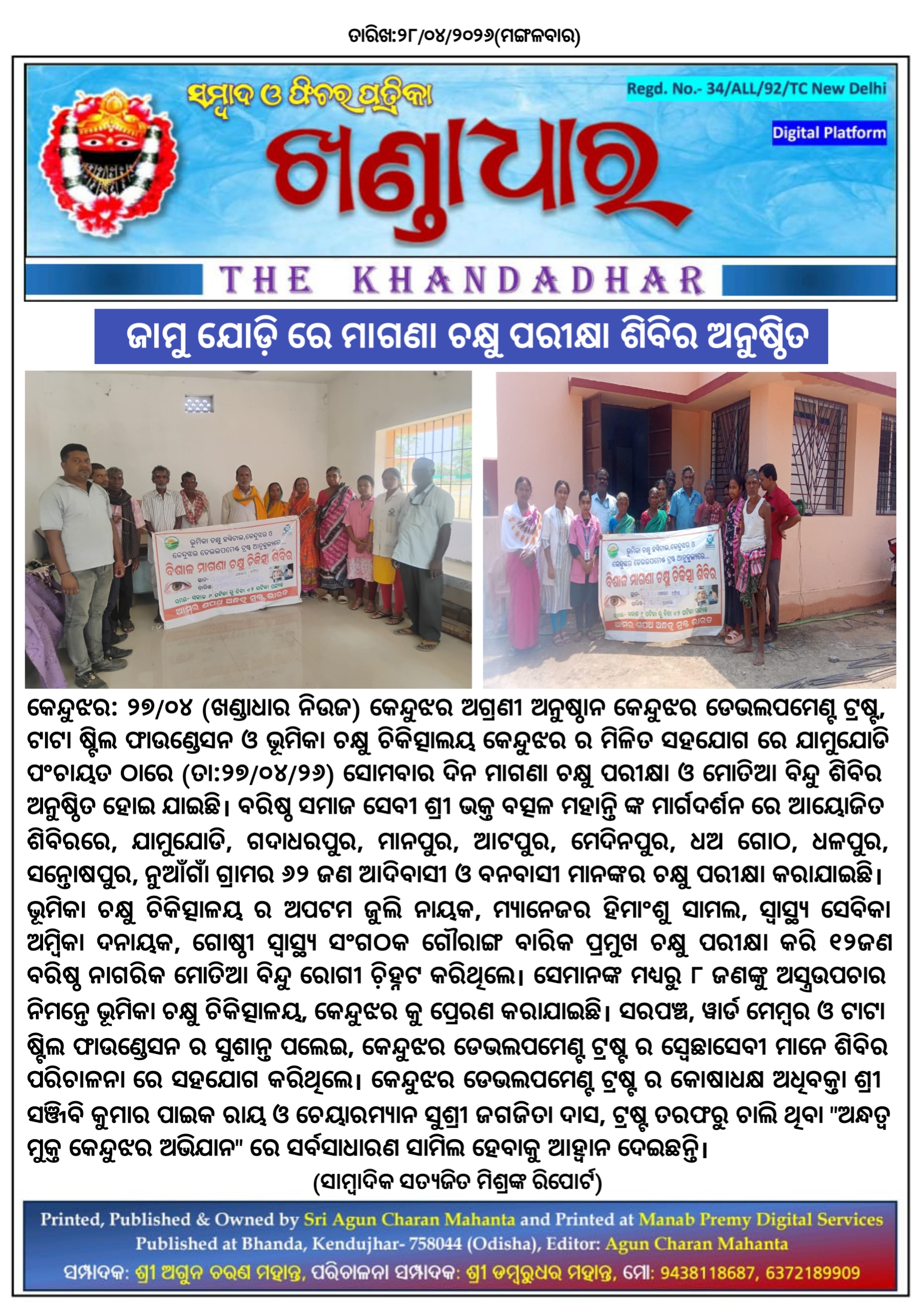 କେନ୍ଦୁଝର: ୨୭/୦୪ (ଖଣ୍ଡାଧାର ନିଉଜ) କେନ୍ଦୁଝର ଅଗ୍ରଣୀ ଅନୁଷ୍ଠାନ କେନ୍ଦୁଝର ଡେଭଲପମେଣ୍ଟ ଟ୍ରଷ୍ଟ, ଟାଟା ଷ୍ଟିଲ ଫାଉଣ୍ଡେସନ ଓ ଭୂମିକା ଚକ୍ଷୁ ଚିକିତ୍ସାଲୟ କେନ୍ଦୁଝର ର ମିଳିତ ସହଯୋଗ ରେ ଯାମୁଯୋଡି ପଂଚାୟତ ଠାରେ (ତା:୨୭/୦୪/୨୬) ସୋମବାର ଦିନ ମାଗଣା ଚକ୍ଷୁ ପରୀକ୍ଷା ଓ ମୋତିଆ ବିନ୍ଦୁ ଶିବିର ଅନୁଷ୍ଠିତ ହୋଇ ଯାଇଛି। ବରିଷ୍ଠ ସମାଜ ସେବୀ ଶ୍ରୀ ଭକ୍ତ ବତ୍ସଳ ମହାନ୍ତି ଙ୍କ ମାର୍ଗଦର୍ଶନ ରେ ଆୟୋଜିତ ଶିବିରରେ, ଯାମୁଯୋଡି, ଗଦାଧରପୁର, ମାନପୁର, ଆଟପୁର, ମେଦିନପୁର, ଧଅ ଗୋଠ, ଧଳପୁର, ସନ୍ତୋଷପୁର, ନୁଆଁଗାଁ ଗ୍ରାମର ୬୨ ଜଣ ଆଦିବାସୀ ଓ ବନବାସୀ ମାନଙ୍କର ଚକ୍ଷୁ ପରୀକ୍ଷା କରାଯାଇଛି। ଭୂମିକା ଚକ୍ଷୁ ଚିକିତ୍ସାଳୟ ର ଅପଟମ ଜୁଲି ନାୟକ, ମ୍ୟାନେଜର ହିମାଂଶୁ ସାମଲ, ସ୍ୱାସ୍ଥ୍ୟ ସେବିକା ଅମ୍ବିକା ଦନାୟକ, ଗୋଷ୍ଠୀ ସ୍ୱାସ୍ଥ୍ୟ ସଂଗଠକ ଗୌରାଙ୍ଗ ବାରିକ ପ୍ରମୁଖ ଚକ୍ଷୁ ପରୀକ୍ଷା କରି ୧୨ଜଣ ବରିଷ୍ଠ ନାଗରିକ ମୋତିଆ ବିନ୍ଦୁ ରୋଗୀ ଚି଼ହ୍ନଟ କରିଥିଲେ। ସେମାନଙ୍କ ମଧ୍ୟରୁ ୮ ଜଣଙ୍କୁ ଅସ୍ତ୍ରଉପଚାର ନିମନ୍ତେ ଭୂମିକା ଚକ୍ଷୁ ଚିକିତ୍ସାଳୟ, କେନ୍ଦୁଝର କୁ ପ୍ରେରଣ କରାଯାଇଛି। ସରପଞ୍ଚ, ୱାର୍ଡ ମେମ୍ବର ଓ ଟାଟା ଷ୍ଟିଲ ଫାଉଣ୍ଡେସନ ର ସୁଶାନ୍ତ ପଲେଇ, କେନ୍ଦୁଝର ଡେଭଲପମେଣ୍ଟ ଟ୍ରଷ୍ଟ ର ସ୍ବେଛାସେବୀ ମାନେ ଶିବିର ପରିଚାଳନା ରେ ସହଯୋଗ କରିଥିଲେ। କେନ୍ଦୁଝର ଡେଭଲପମେଣ୍ଟ ଟ୍ରଷ୍ଟ ର କୋଷାଧକ୍ଷ ଅଧିବକ୍ତା ଶ୍ରୀ ସଞ୍ଜିବି କୁମାର ପାଇକ ରାୟ ଓ ଚେୟାରମ୍ୟାନ ସୁଶ୍ରୀ ଜଗଜିତା ଦାସ, ଟ୍ରଷ୍ଟ ତରଫରୁ ଚାଲି ଥିବା "ଅନ୍ଧତ୍ୱ ମୁକ୍ତ କେନ୍ଦୁଝର ଅଭିଯାନ" ରେ ସର୍ବସାଧାରଣ ସାମିଲ ହେବାକୁ ଆହ୍ୱାନ ଦେଇଛନ୍ତି।