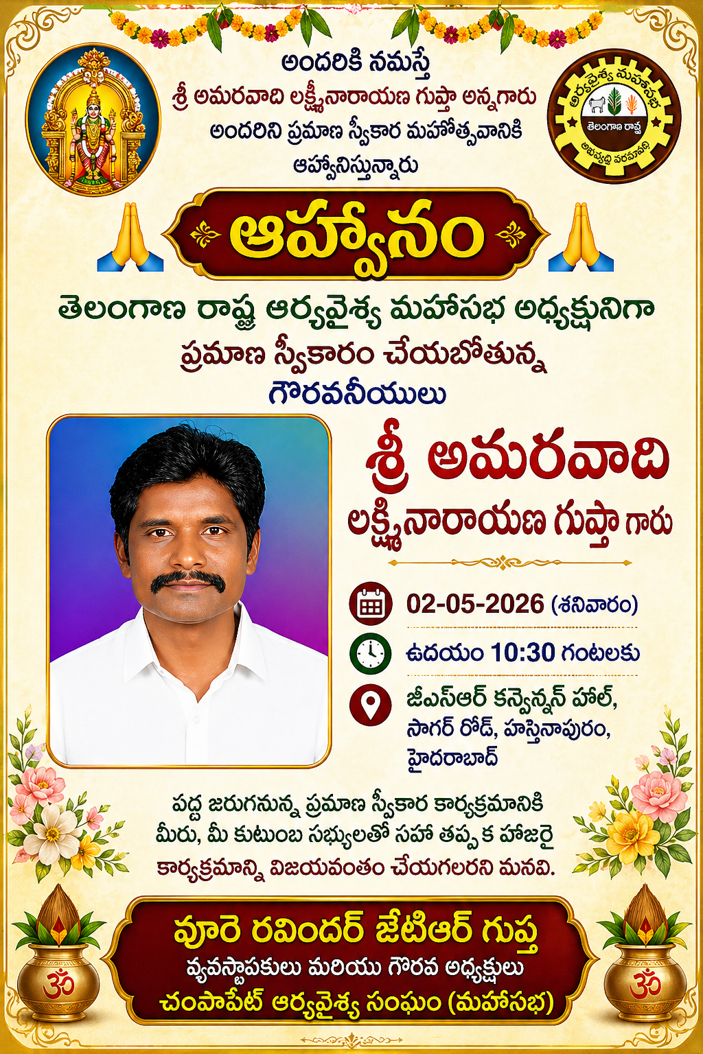 తెలంగాణ రాష్ట్ర ఆర్యవైశ్య మహాసభ అధ్యక్షులు అమరవాది లక్ష్మీనారాయణ గుప్త గారి ప్రమాణ స్వీకార మహోత్సవానికి ప్రత్యేక ఆహ్వానం