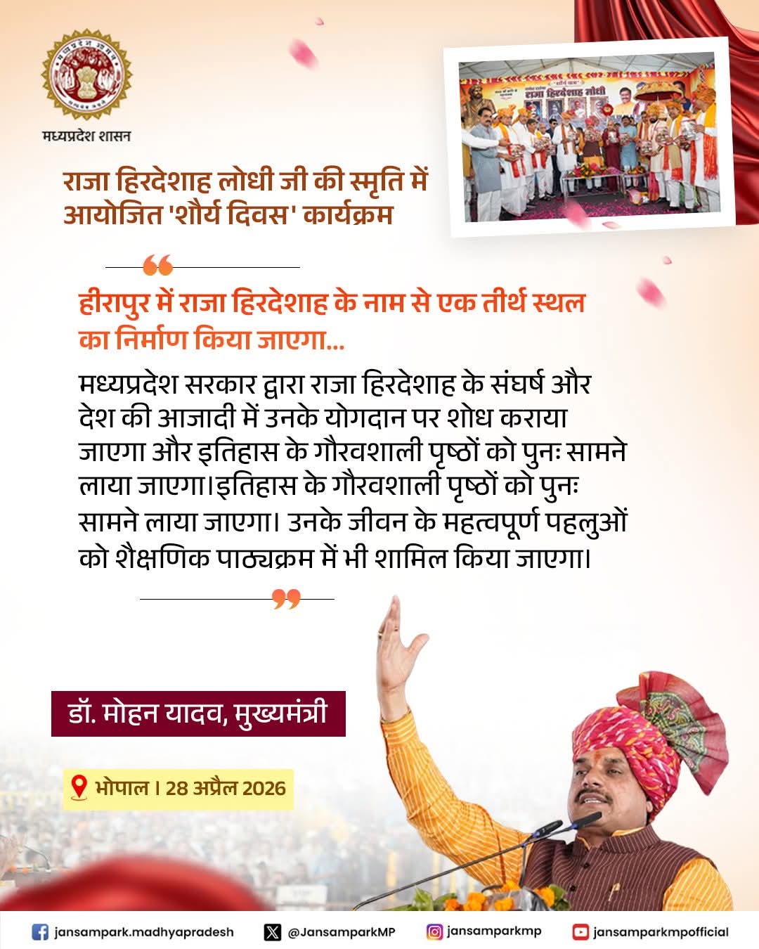 #मध्यप्रदेश सरकार द्वारा राजा हिरदेशाह के संघर्ष व देश की आजादी में उनके योगदान पर शोध कराया जाएगा और इतिहास के गौरवशाली पृष्ठों को पुनः सामने लाया जाएगा। उनके जीवन के महत्वपूर्ण पहलुओं को शैक्षणिक पाठ्यक्रम में भी शामिल किया जाएगा।