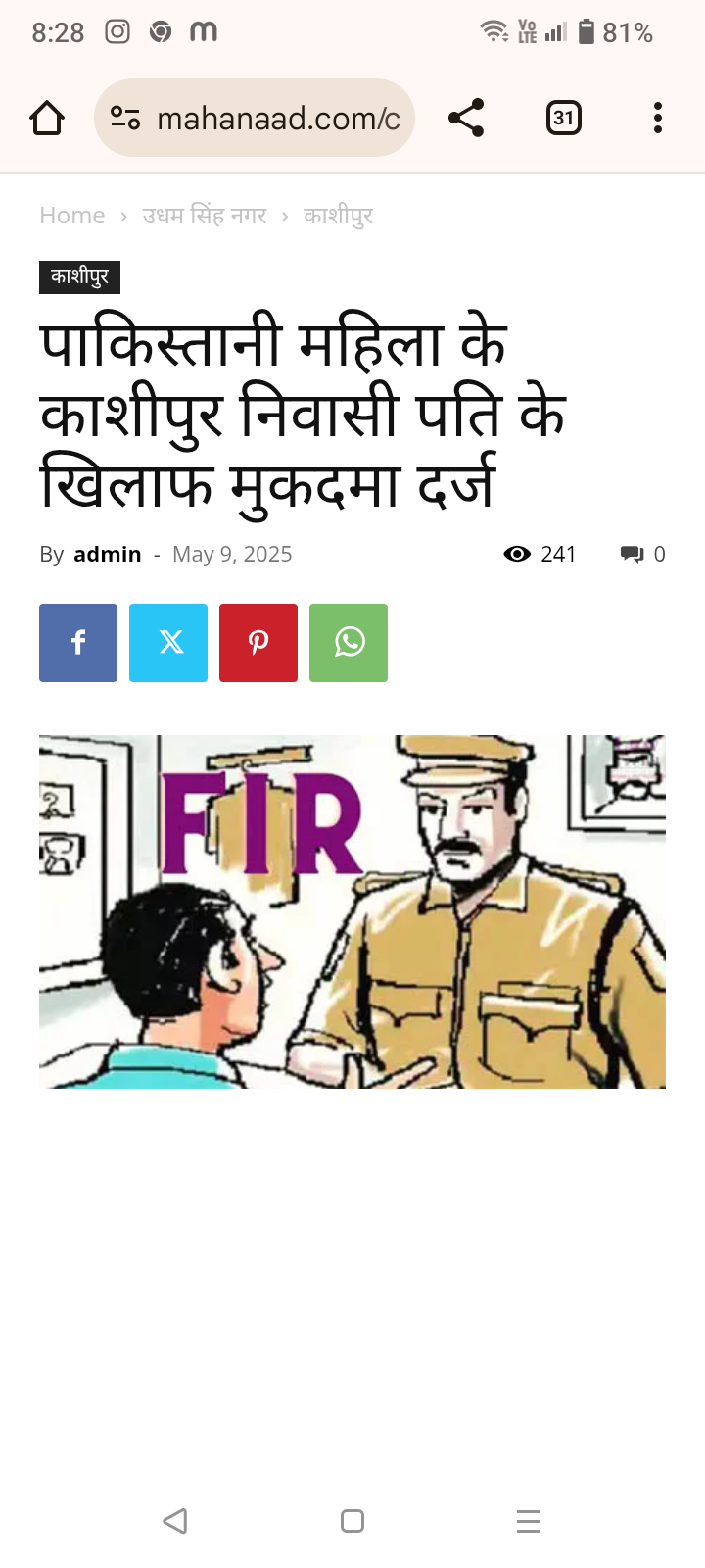 पाकिस्तानी महिला के काशीपुर निवासी पति के खिलाफ मुकदमा दर्ज l