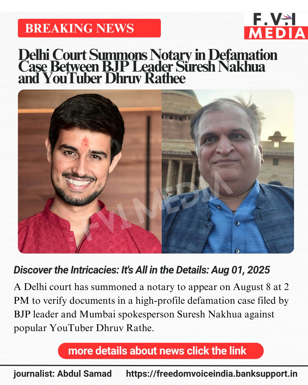 News info: A Delhi court has summoned a notary to appear on August 8 at 2 PM to verify documents in a high-profile defamation case filed by BJP leader and Mumbai spokesperson Suresh Nakhua against popular YouTuber Dhruv Rathee. The legal battle, which has sparked widespread debate, centers around Rathee’s video titled “My Reply to Godi Youtubers,” where he allegedly made defamatory statements against Nakhua, prompting the latter to seek compensation and a gag order.The controversy escalated when Rathee questioned the authenticity of a notary certificate dated January 26—Republic Day, a public holiday—suggesting it raises doubts about its legitimacy. While some argue notarization on holidays is rare, others, including a comment on X, note that notaries in India occasionally work on such days for an extra fee, though official data on Republic Day activity remains limited.The court’s decision follows Rathee’s legal team highlighting defects in Nakhua’s affidavits, a move that echoes a recent judicial trend. On July 31, 2025, a Delhi court dismissed a similar defamation case by AAP leader Satyender Jain against BJP MP Bansuri Swaraj, signaling heightened scrutiny of political defamation claims. Nakhua has countered by promising to submit supporting judgments, with the court allowing his request.This case taps into the growing intersection of digital media and legal accountability. With Rathee boasting over 20 million YouTube subscribers, his influence is undeniable, while Nakhua’s lawsuit reflects a rising trend of public figures using defamation laws to challenge online criticism. A 2023 Journal of Media Law study reported a 40% increase in such cases in India since 2019, often sparking debates over free speech.Stay tuned as the legal proceedings unfold, with the notary’s testimony expected to be a key turning point in this politically charged dispute.