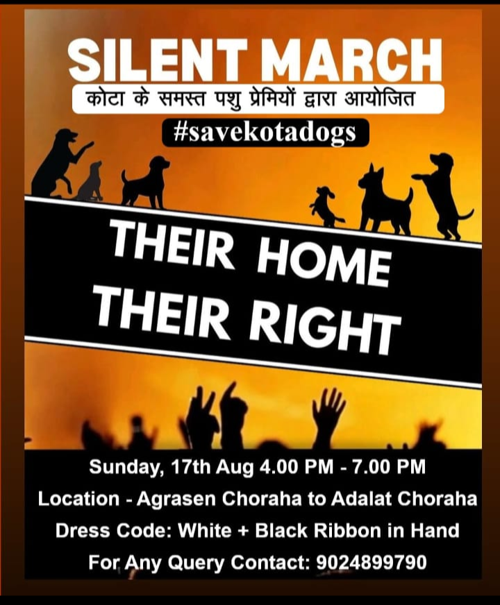 राजस्थान सरकार द्वारा सामुदायिक कुत्तों को उनके घरों और सड़कों से पिंजरे में बंद करने और हटाने की अनुमति देने के नियम के जवाब में, कोटा के समस्त पशु प्रेमियों ने "कोटा के कुत्तों को बचाओ" शीर्षक से एक शांतिपूर्ण रैली का आह्वान किया है। पशु प्रेमी सोनल गुप्ता ने बताया कि