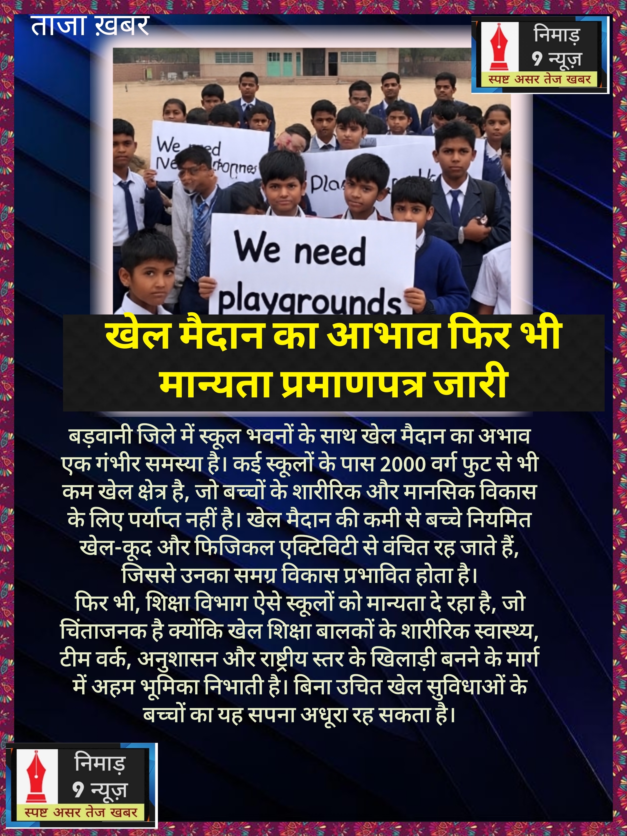 बड़वानी जिले के विद्यालय भवन, जहां शिक्षा का सपना अधूरा रह जाता है। खेल के मैदानों की कमी से बच्चे तरसते हैं, उनकी ऊर्जा और उत्साह पर जैसे लगाम लग गई है। जिला बडवानी में कई स्कूलभवन में 2000 वर्ग फिट भी जगह नही है फिर स्कूलों भवन को मान्यता दी गई हैं जो एक बेडमिंटन कोर्ट की भी पर्याप्त नही है