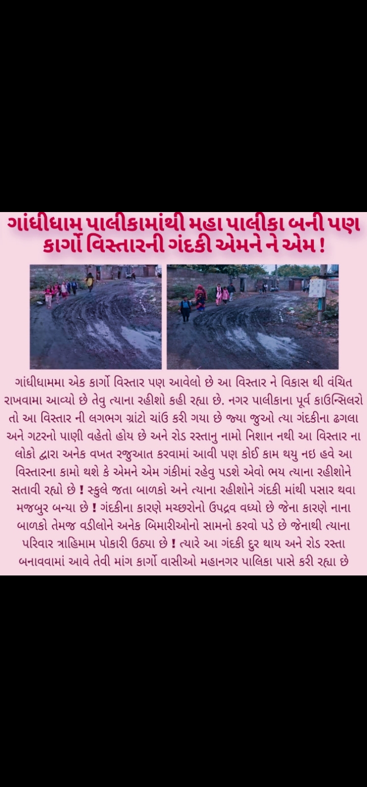 ગાંધીધામમાં એક વિસ્તારા પણ આવેલો છે આ વિસ્તાર ને વિકાસથી વંચિત રાખવામાં આવે છે તેવું ત્યાના રહીશો કહી રહ્યા છે નગરપાલિકા ના પૂર્વ કાઉન્સિલરો તો આ વિસ્તાર ની લગભગ ગ્રાન્ટો ચાઉ કરી ગયા છે જ્યાં જુઓ ત્યાં ગંદકી ના ઢગલા અને ગટરનો પાણી વહેતો હોય છે અને રોડ રસ્તાનુ નામો નિશાન નથી આ વિસ્તાર ના લોકો દ્વારા અનેક વખત રજૂઆત કરવામાં આવી પણ કોઇ કામ થયું નઈ હવે આ વિસ્તારના કામો થશે કે એમના એમ ગંદકીમાં રહેવું પડશે એવો ભય ત્યાના રહીશોને સતાવી રહ્યો છે !